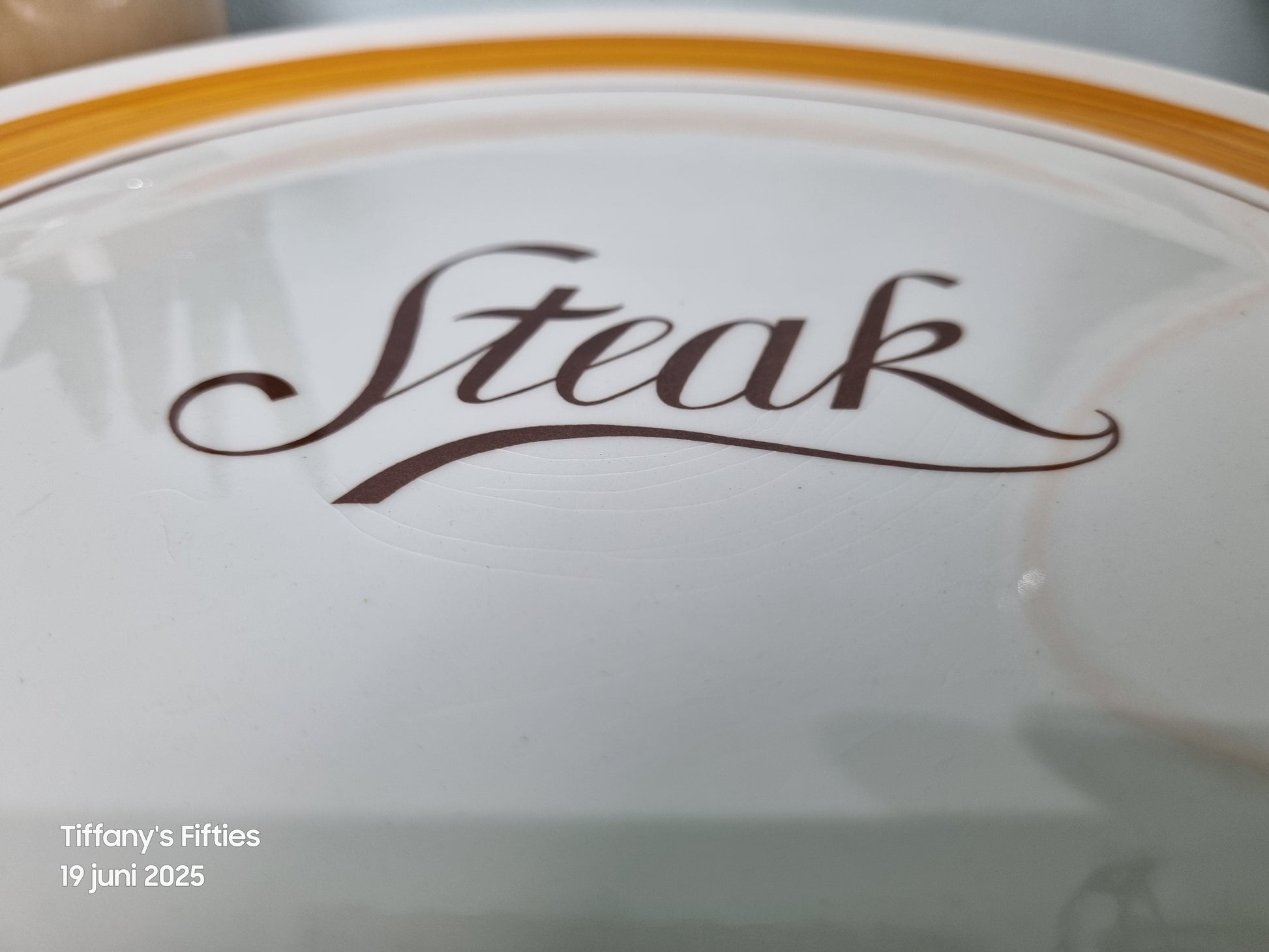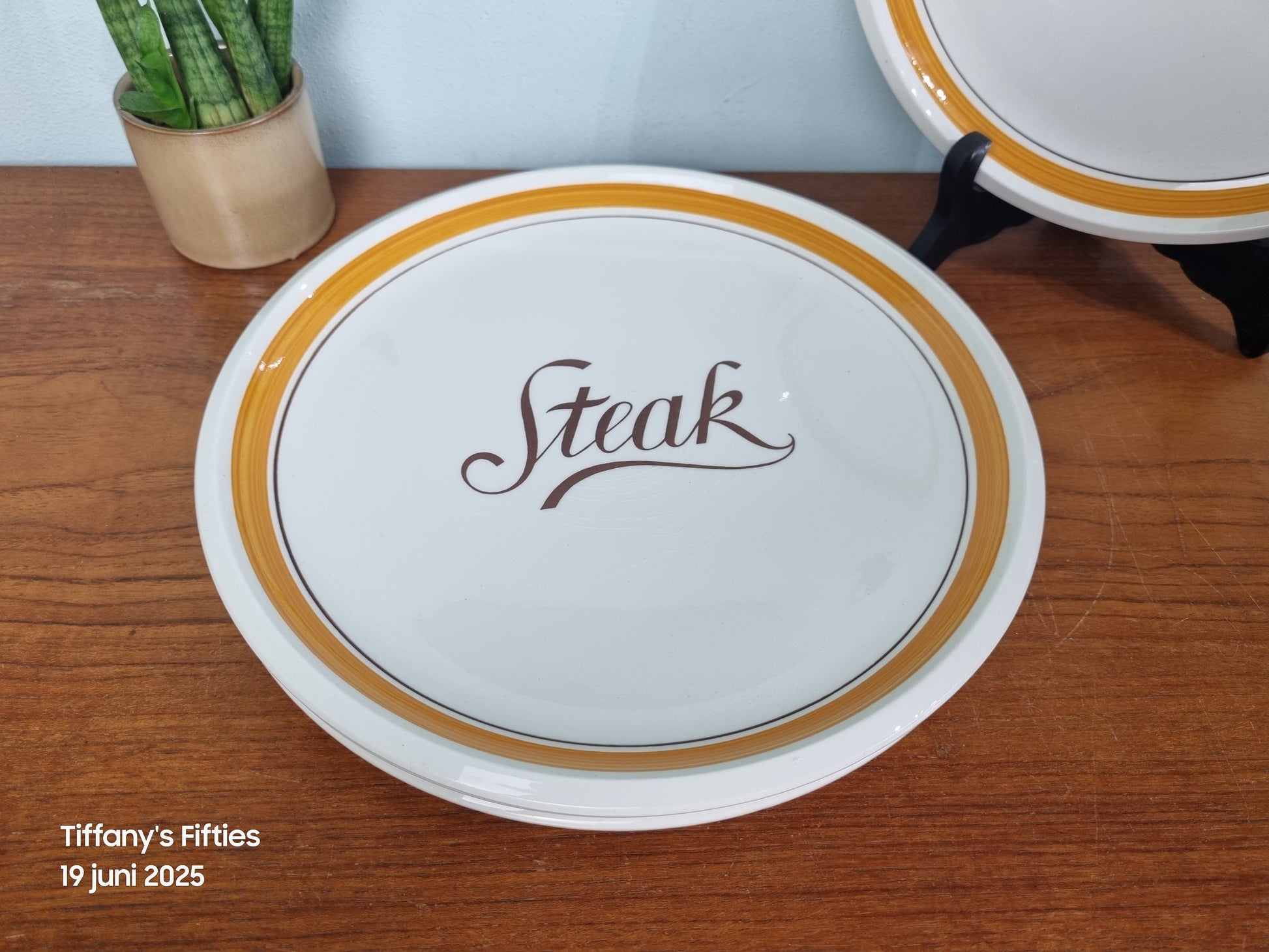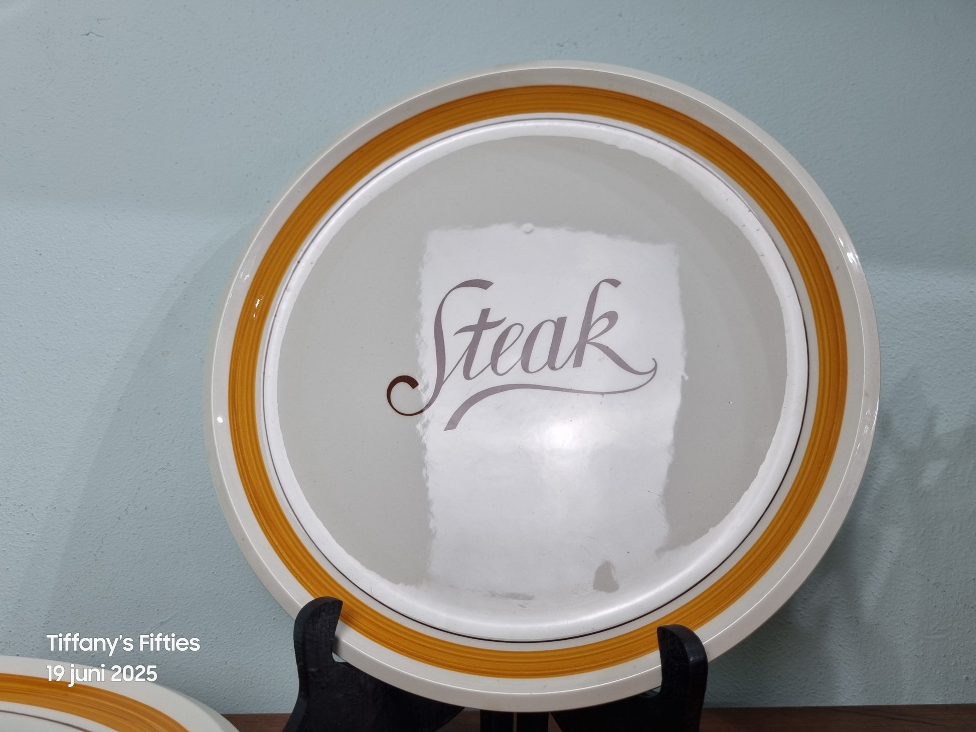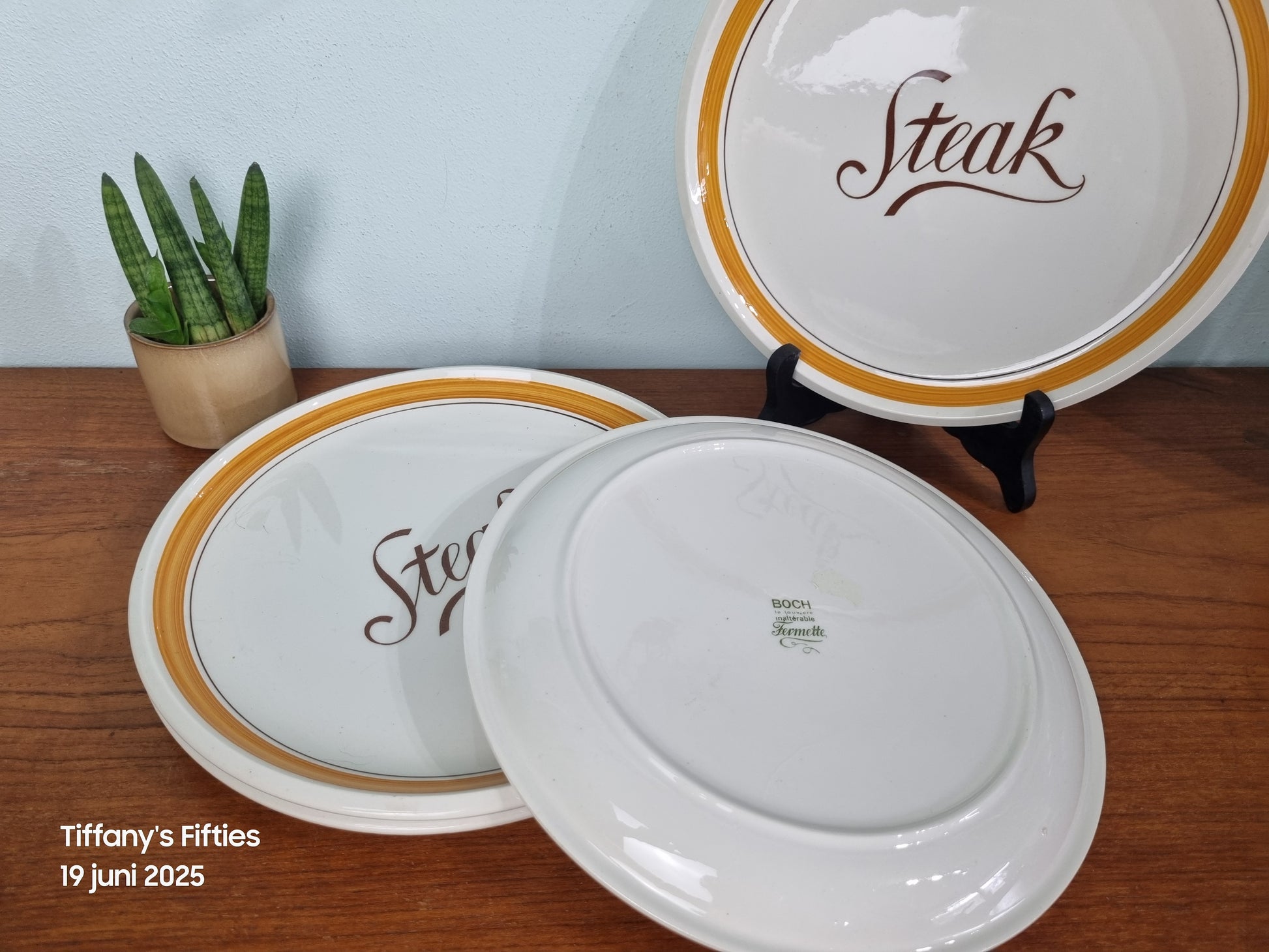 Deze opvallende dinerborden van Boch Frères uit de reeks Fermette zijn uitgevoerd in een grafisch typografisch decor uit de jaren ’60 of vroege jaren ’70. Het woord “Steak” is sierlijk gecentreerd op het bord aangebracht in chocoladekleurige scriptletters, omlijst door een warme mosterdgele en bruine bies. De eenvoudige, platte vorm en het glanzend crèmekleurige fond maken dit servies tot een stijlvoll retro diner-cultuur.