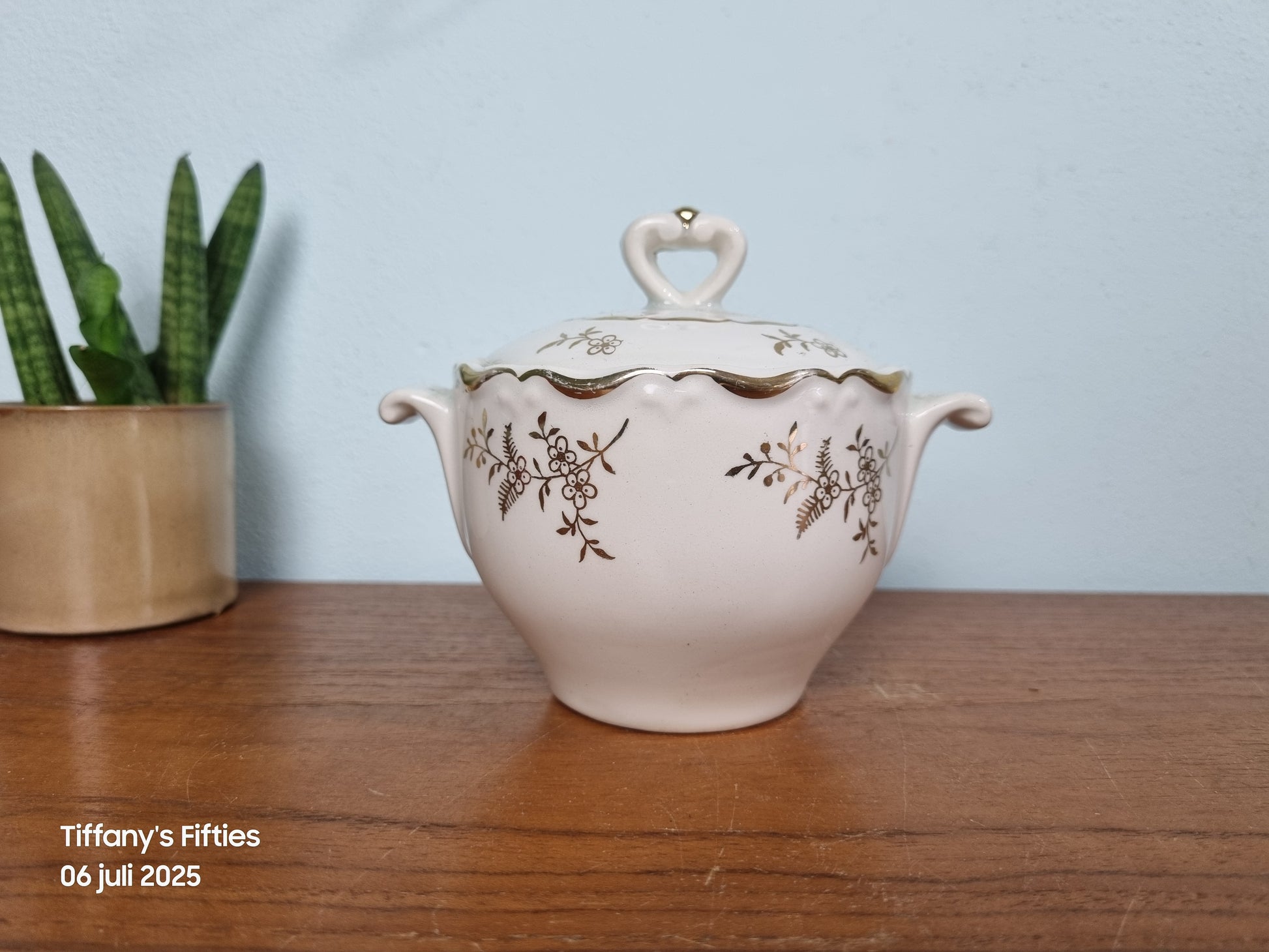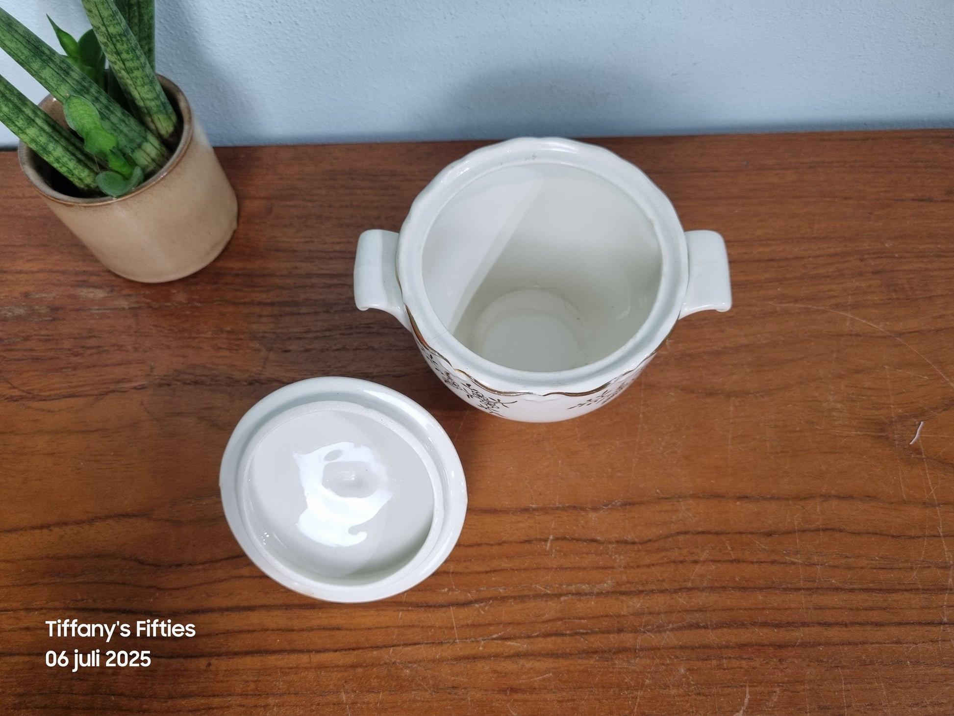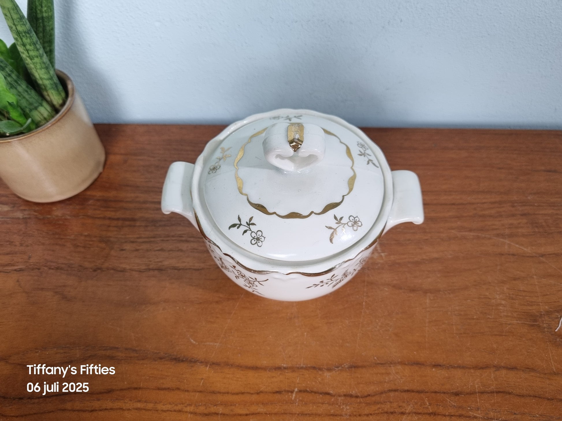 Goede vintage staat. Geen barsten of chips. Gouddecor deels iets vervaagd op de rand en knop, wat past bij de leeftijd.