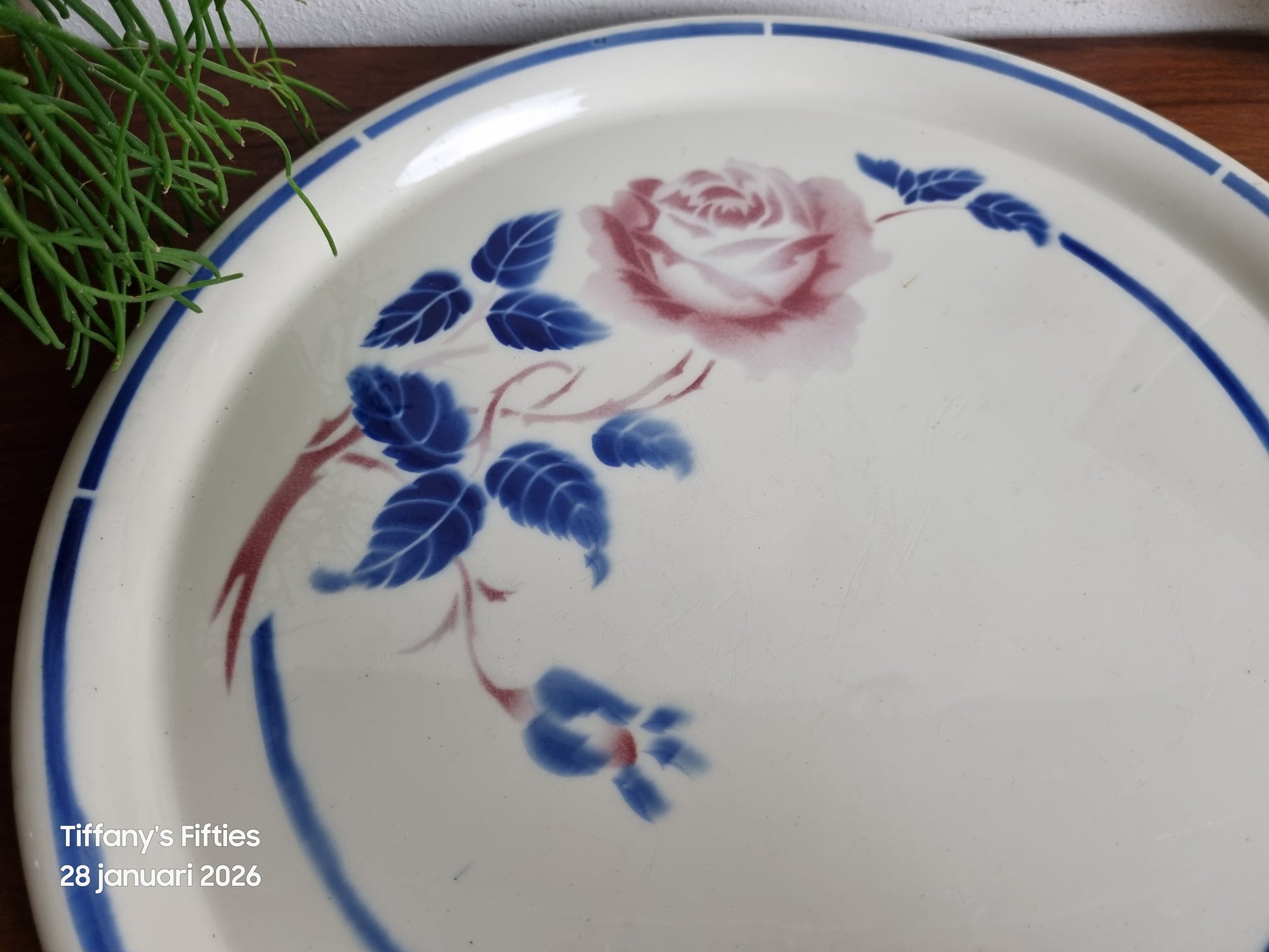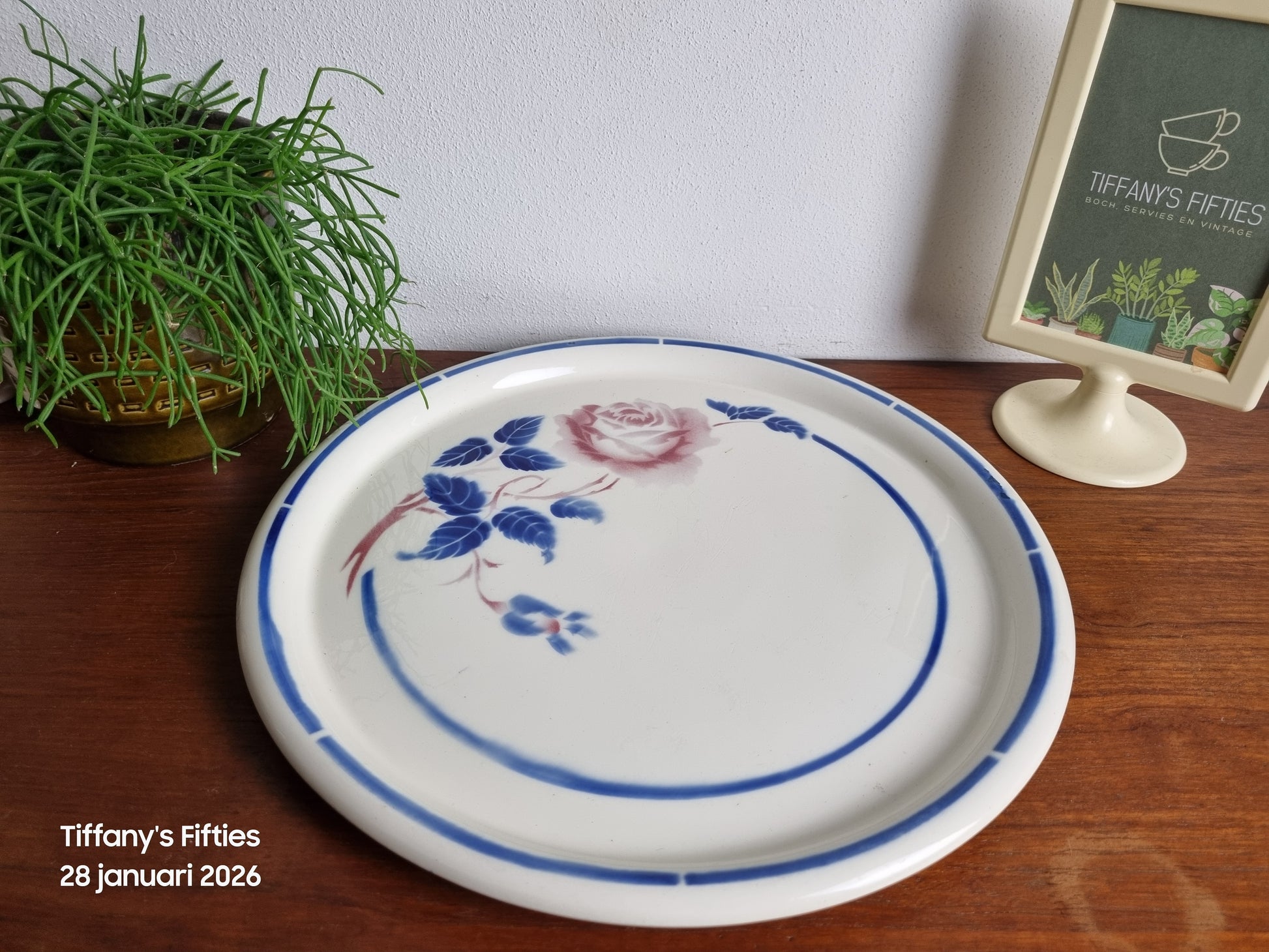 Goede vintage staat. Kleine chip aan de onderkant van de rand. Lichte gebruikssporen en fijne oppervlaktesporen passend bij de leeftijd.