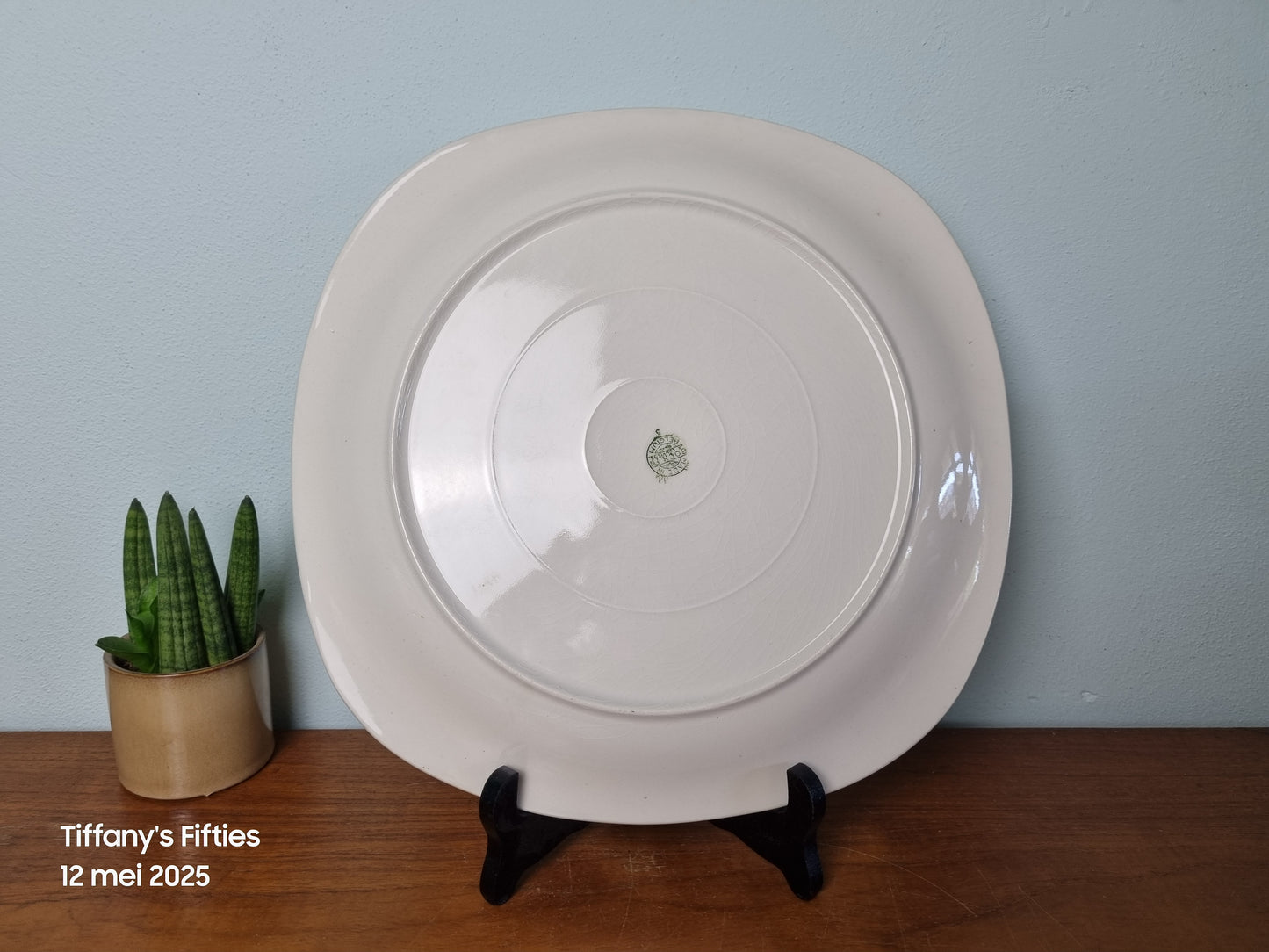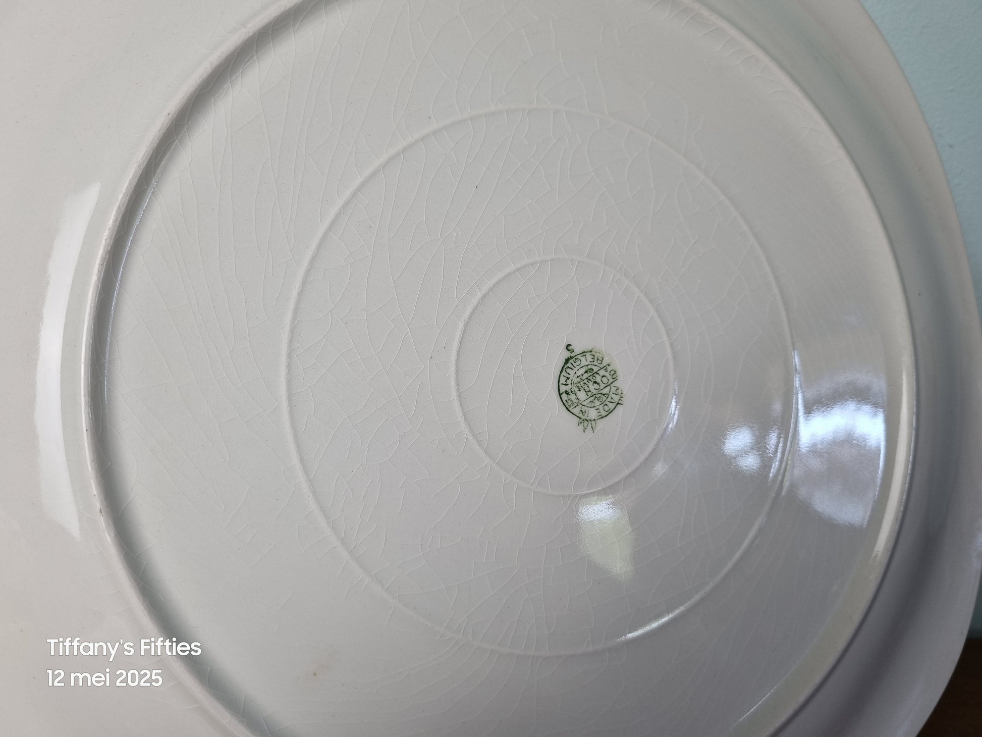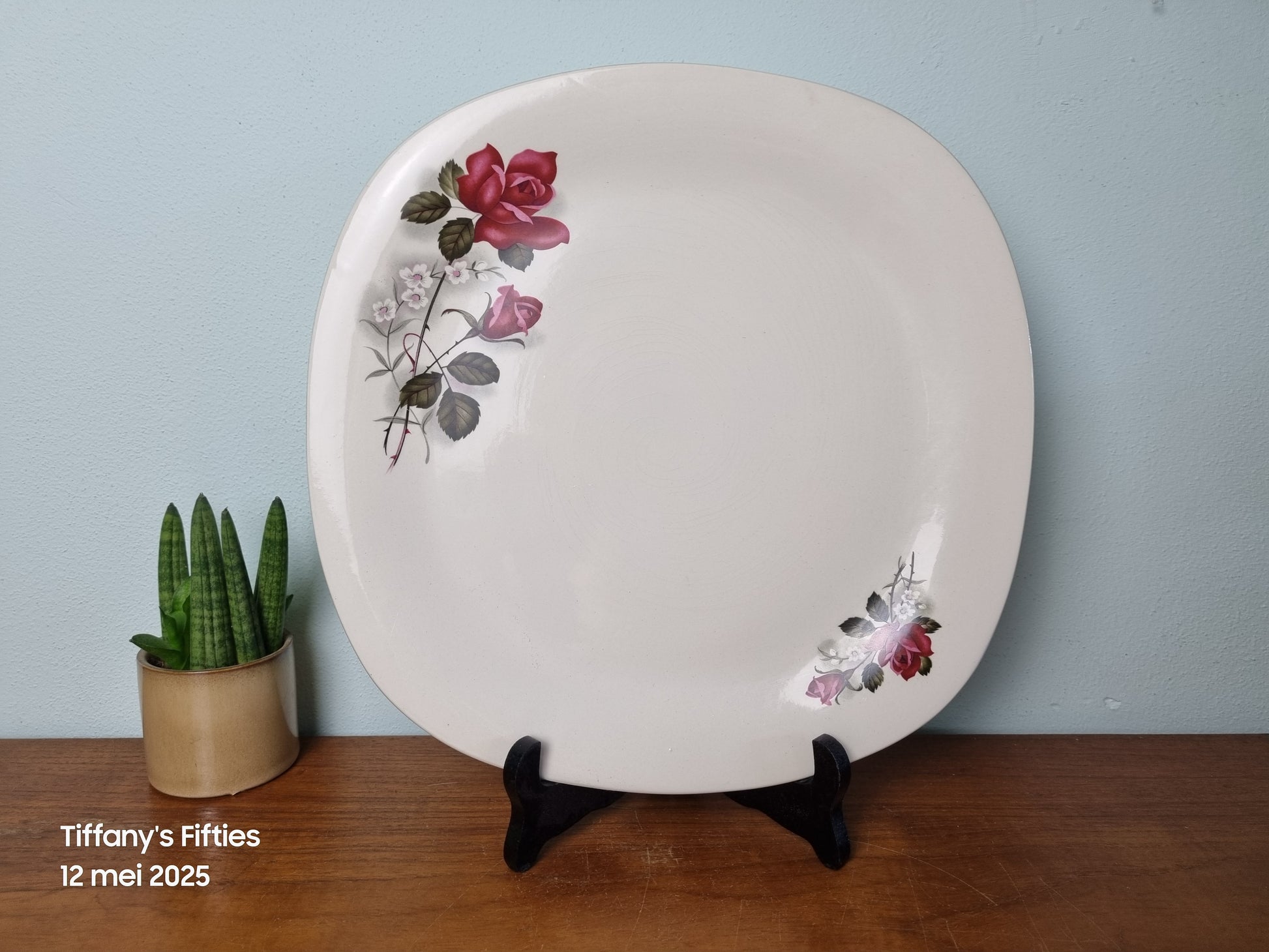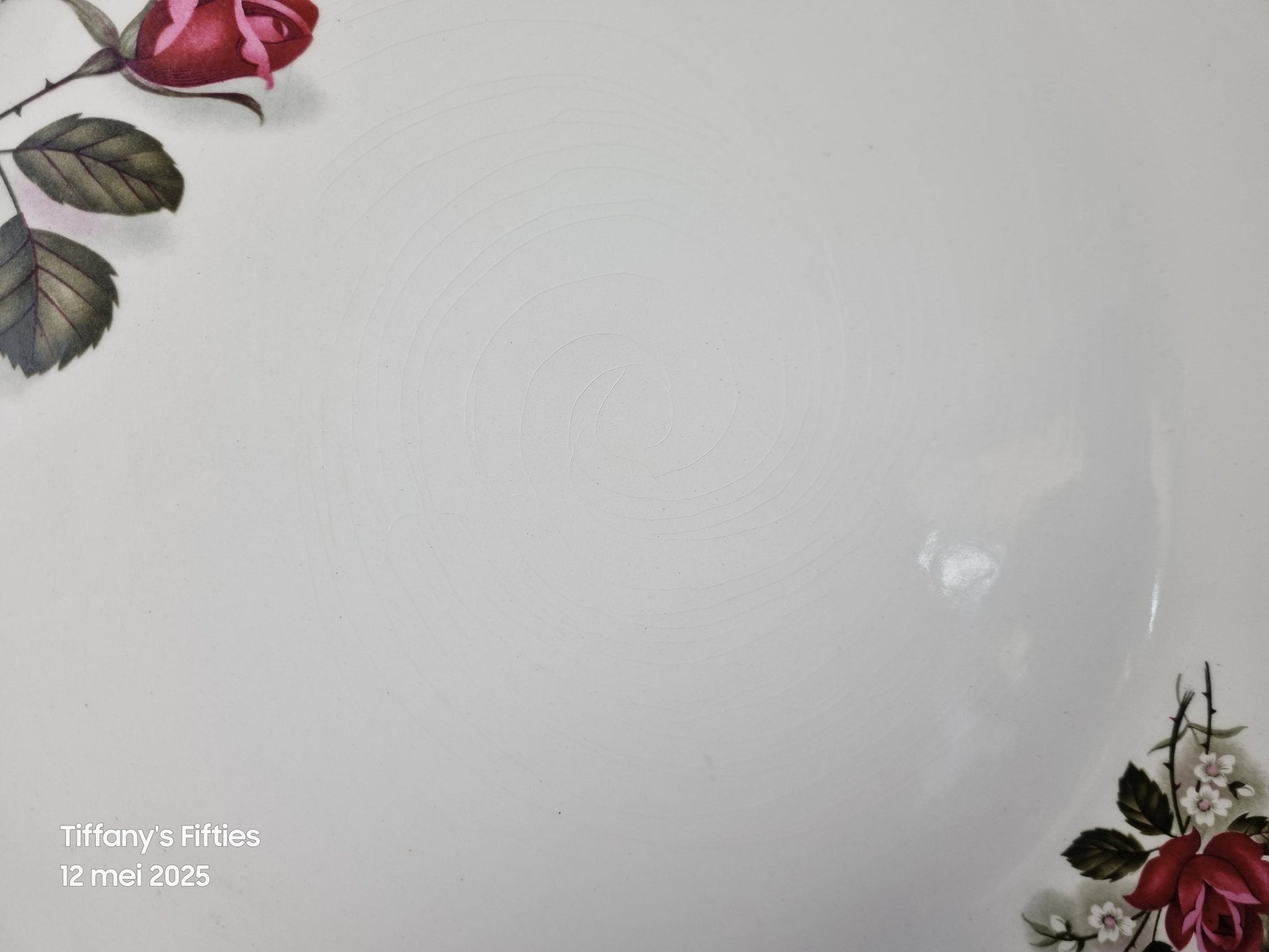 Mooie grote taarschaal van Boch La Louviere uit de reeks Seduction van 1959 met mooie klassieke tekening van een rode roos, decor Pompadour. Mooie, lichtgebruikte staat met enkele lijntjes craquelee. Diameter 30 cm.