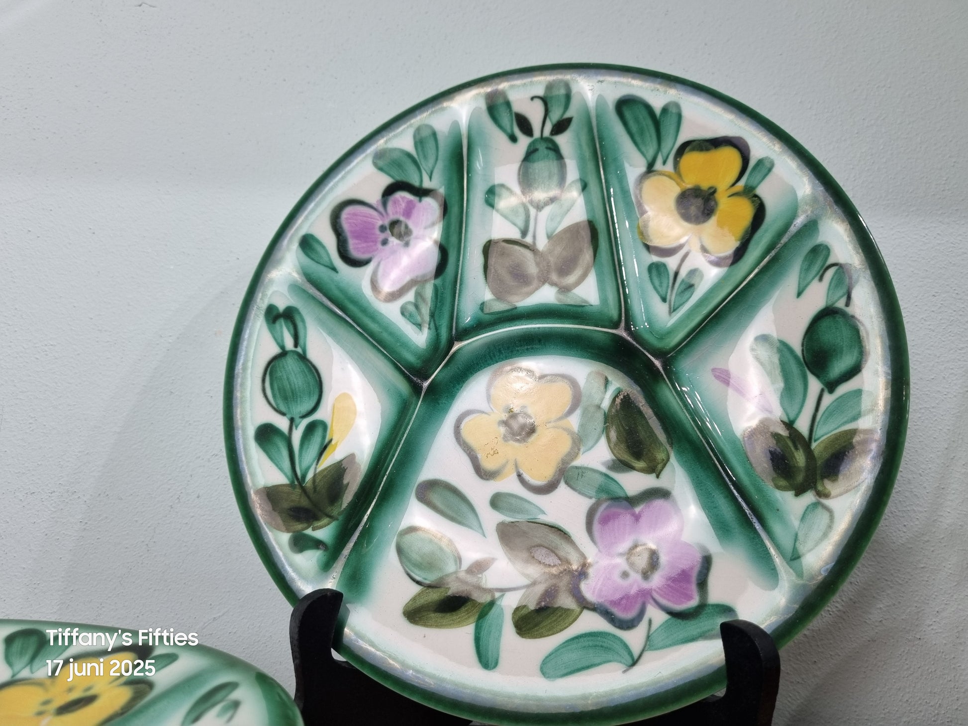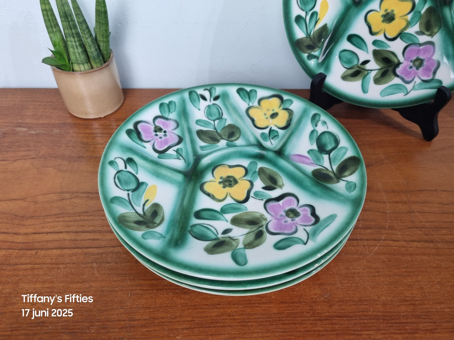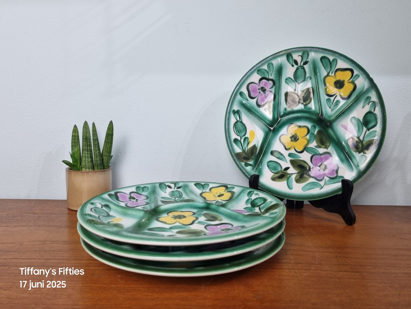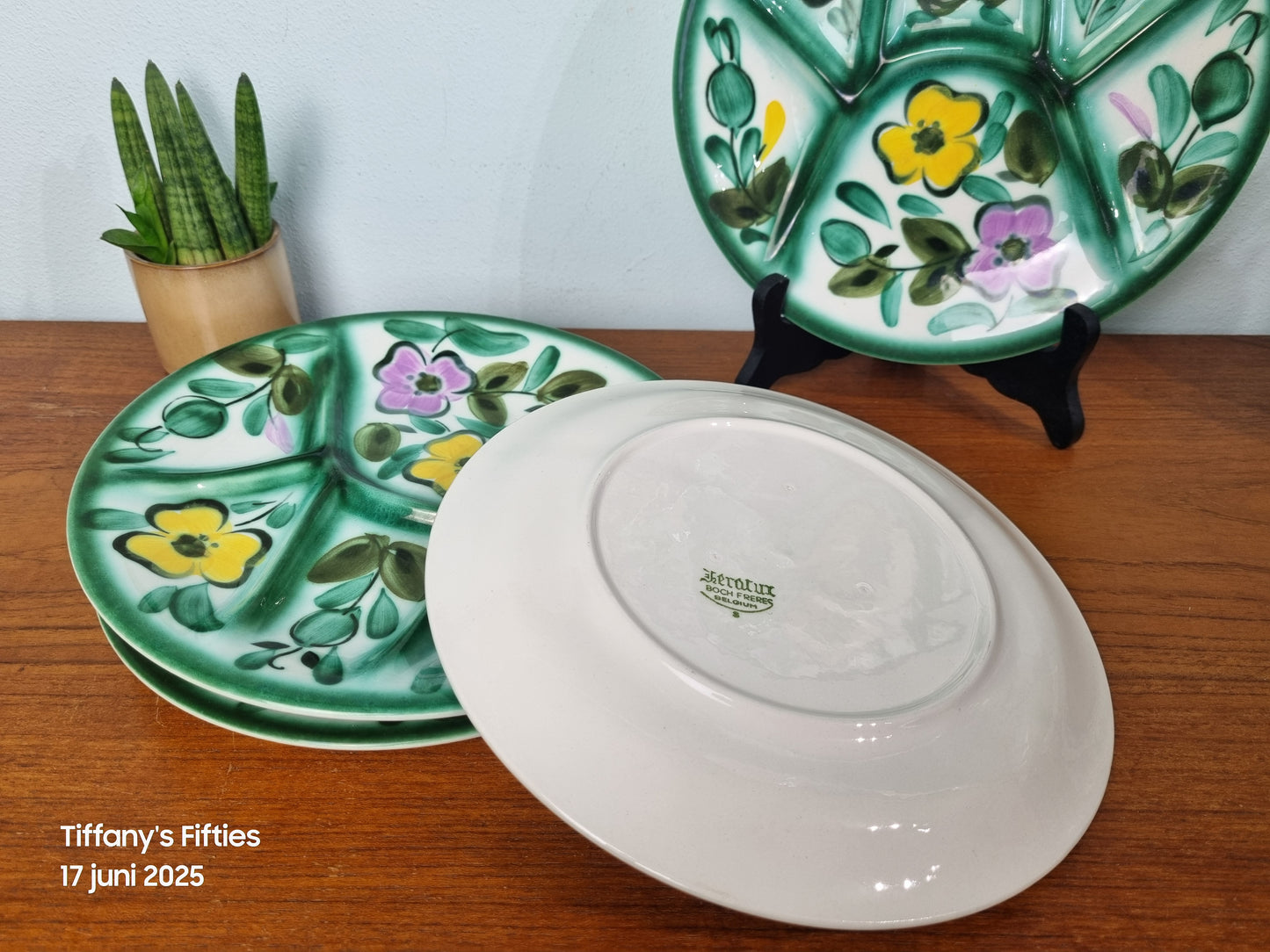 Opvallende vintage vakborden van Boch La Louvière, uitgevoerd in het vrolijke handgeschilderde bloemendecor “In the Mood”. De borden zijn ingedeeld in vijf compartimenten, ideaal voor bijvoorbeeld tapas, fondue, gourmet of buffetgebruik.