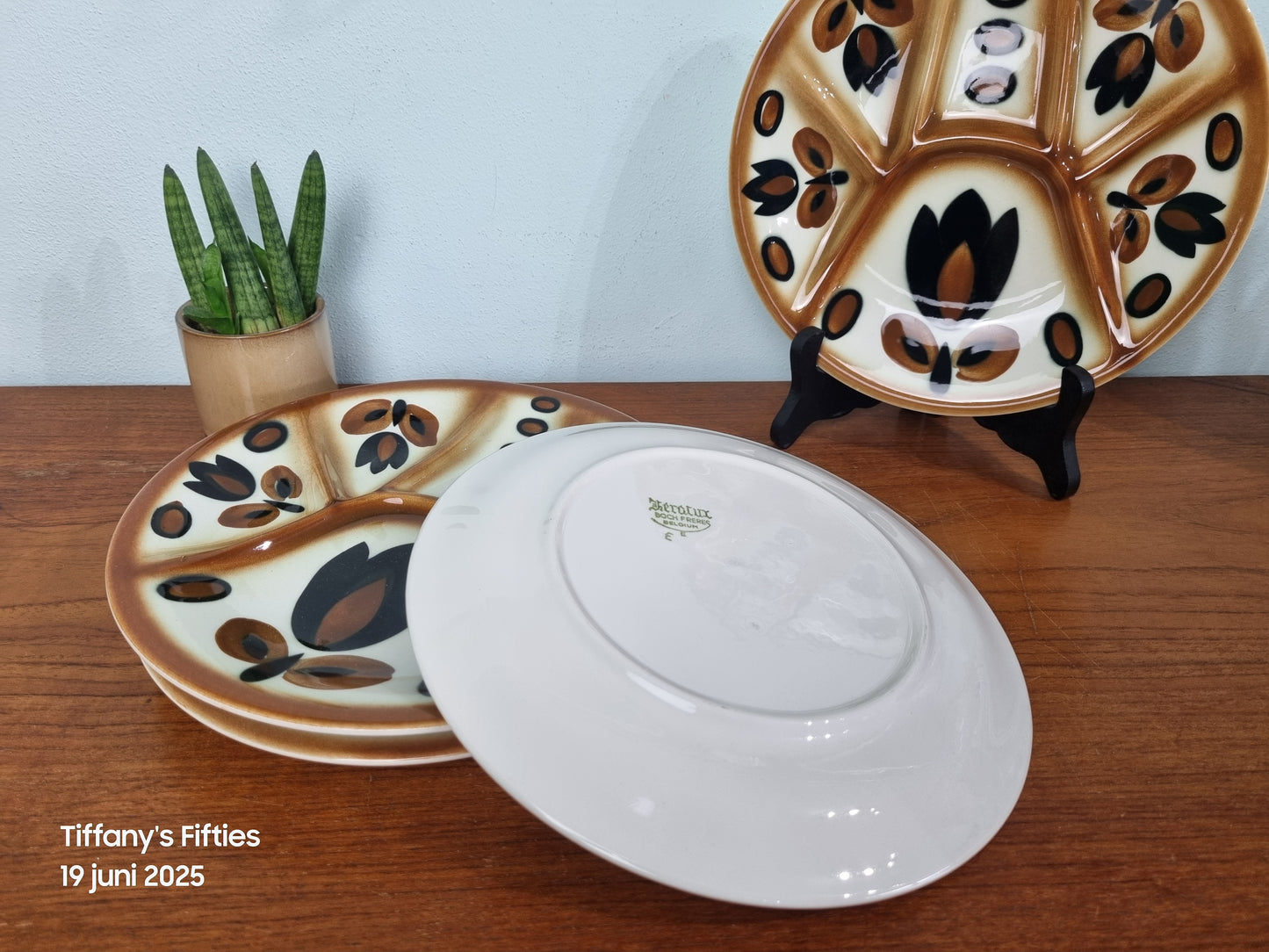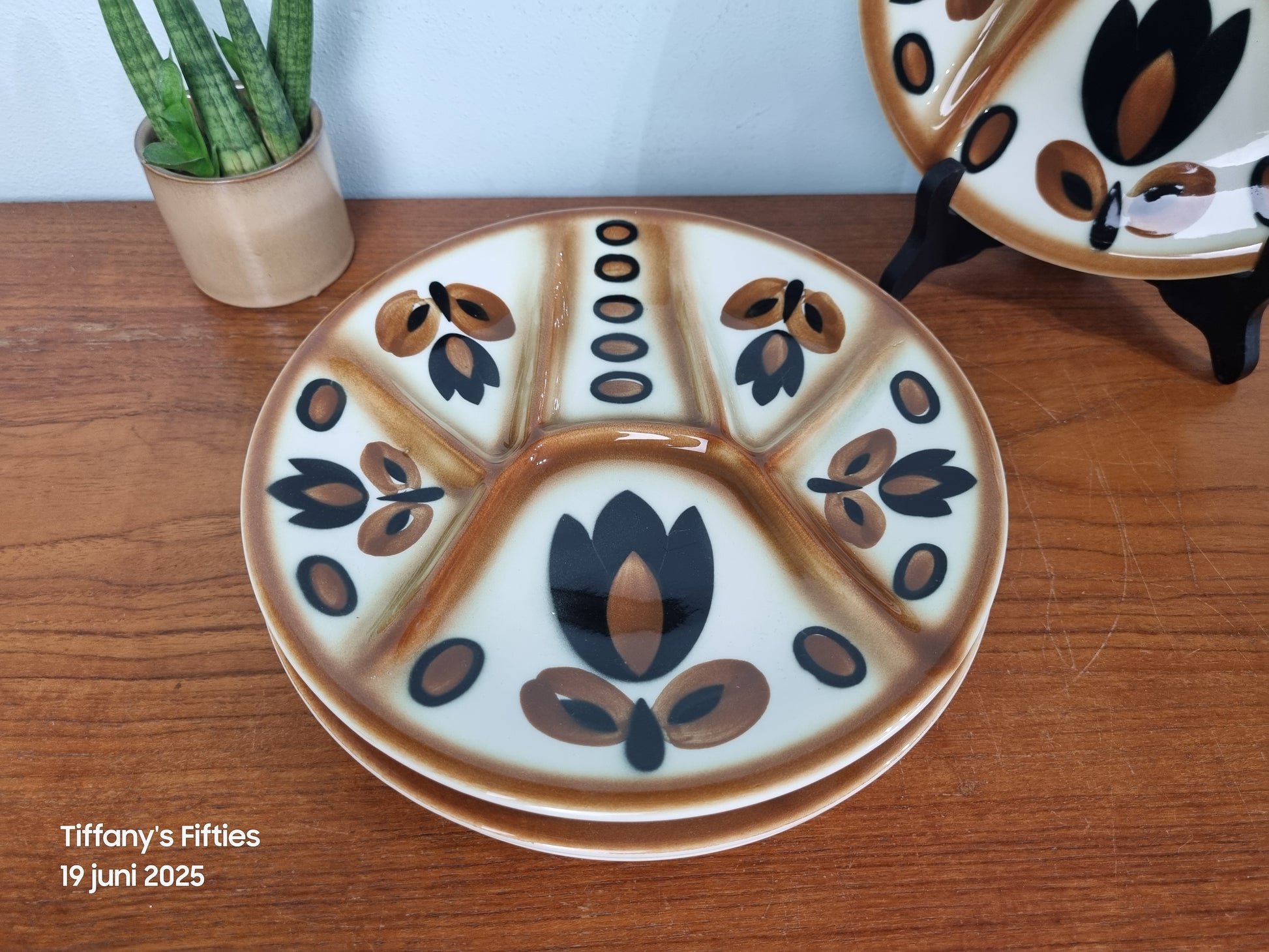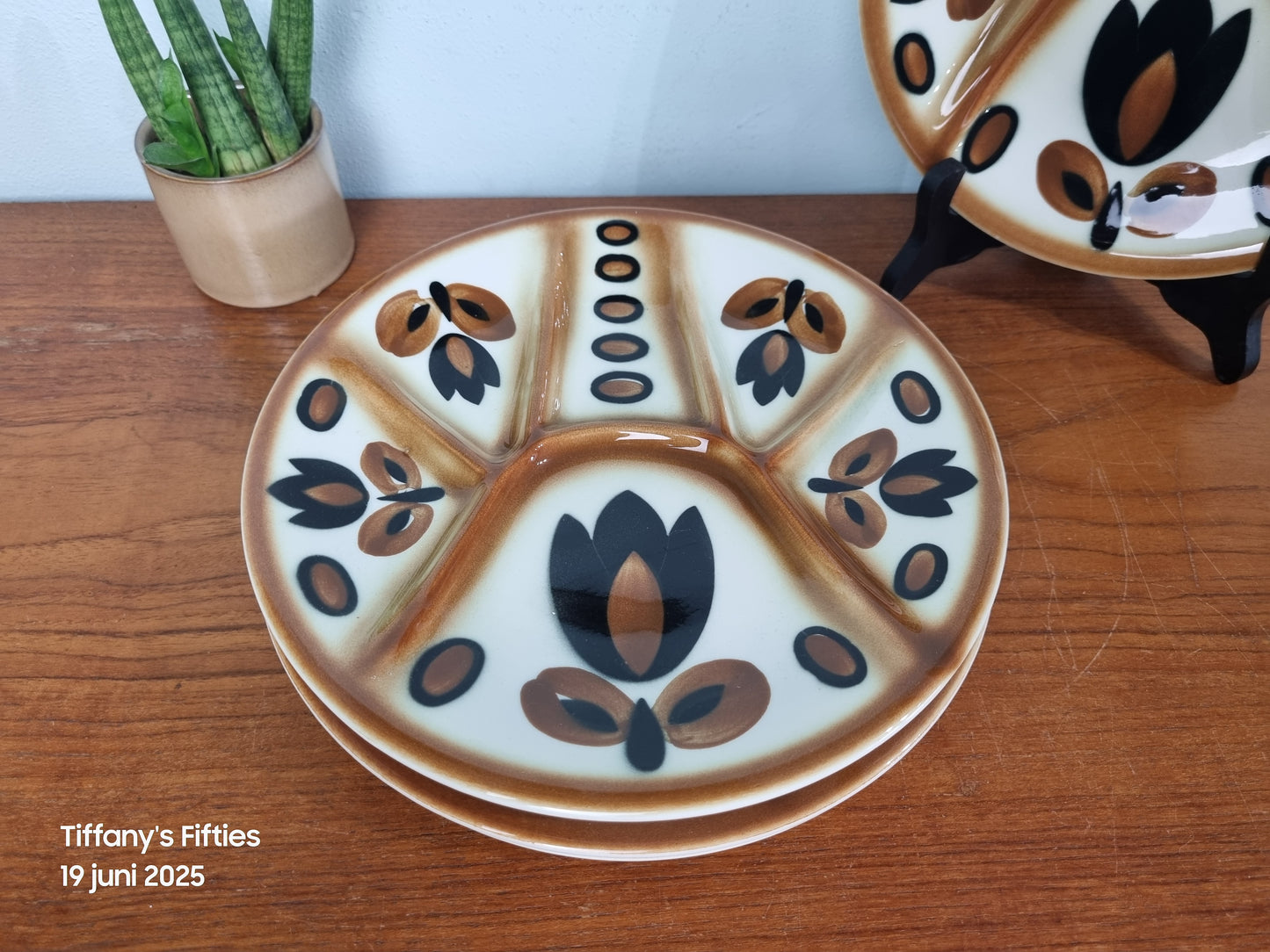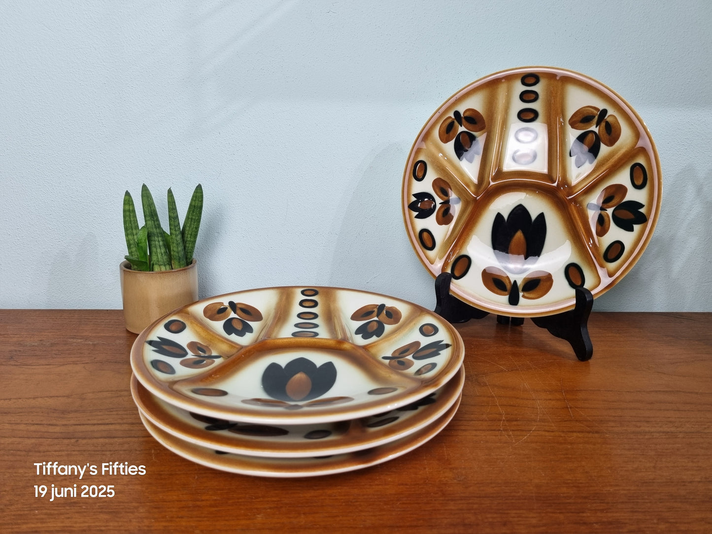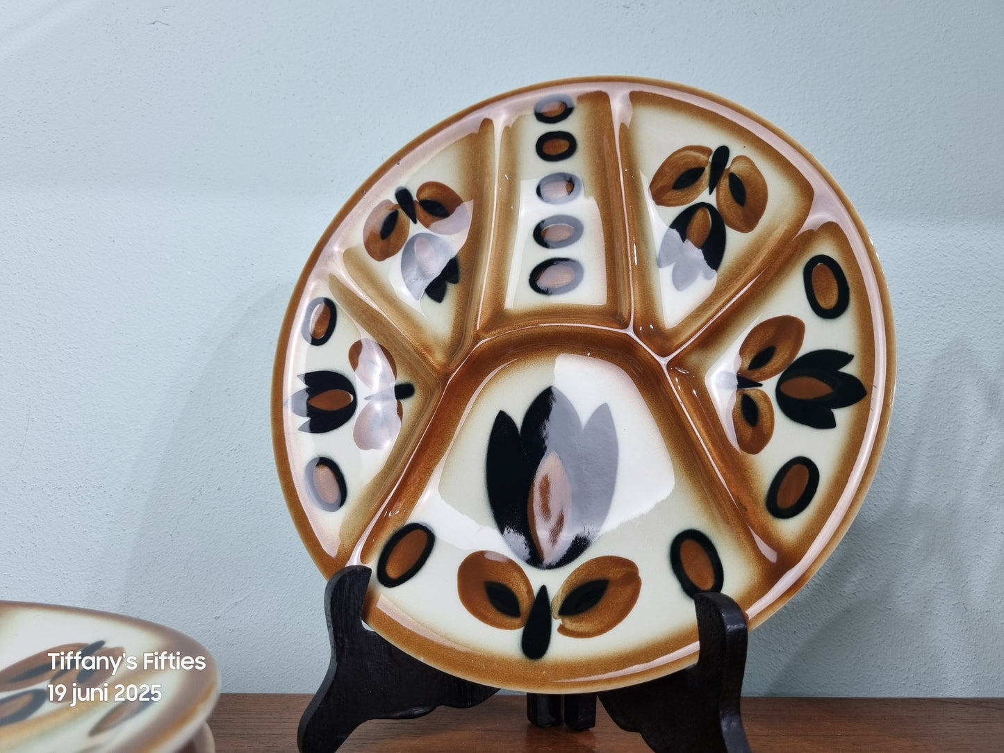 De warme tinten van bruin, zwart en oker op een crèmekleurige achtergrond vormen een speels bloemendecor met een uitgesproken jaren ’70-uitstraling. De vijfdelige indeling van het bord maakt dit stuk niet alleen decoratief, maar ook bijzonder praktisch voor fondue, tapas of een retro ‘TV-diner’. De combinatie van het grafische motief en de rustieke vormgeving is typerend voor het Belgische keramiekdesign uit die periode.