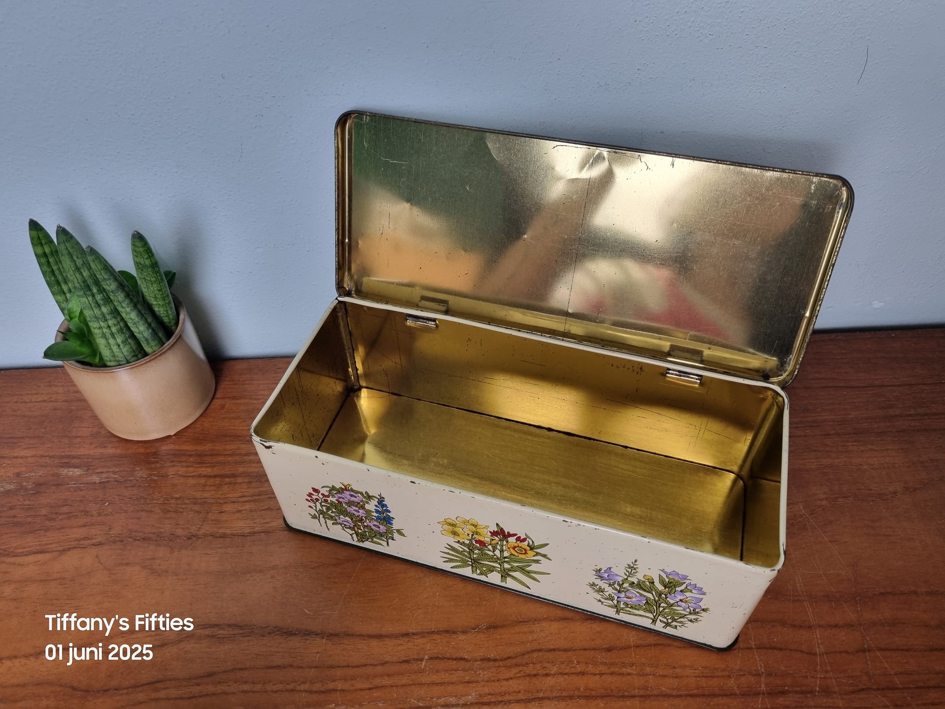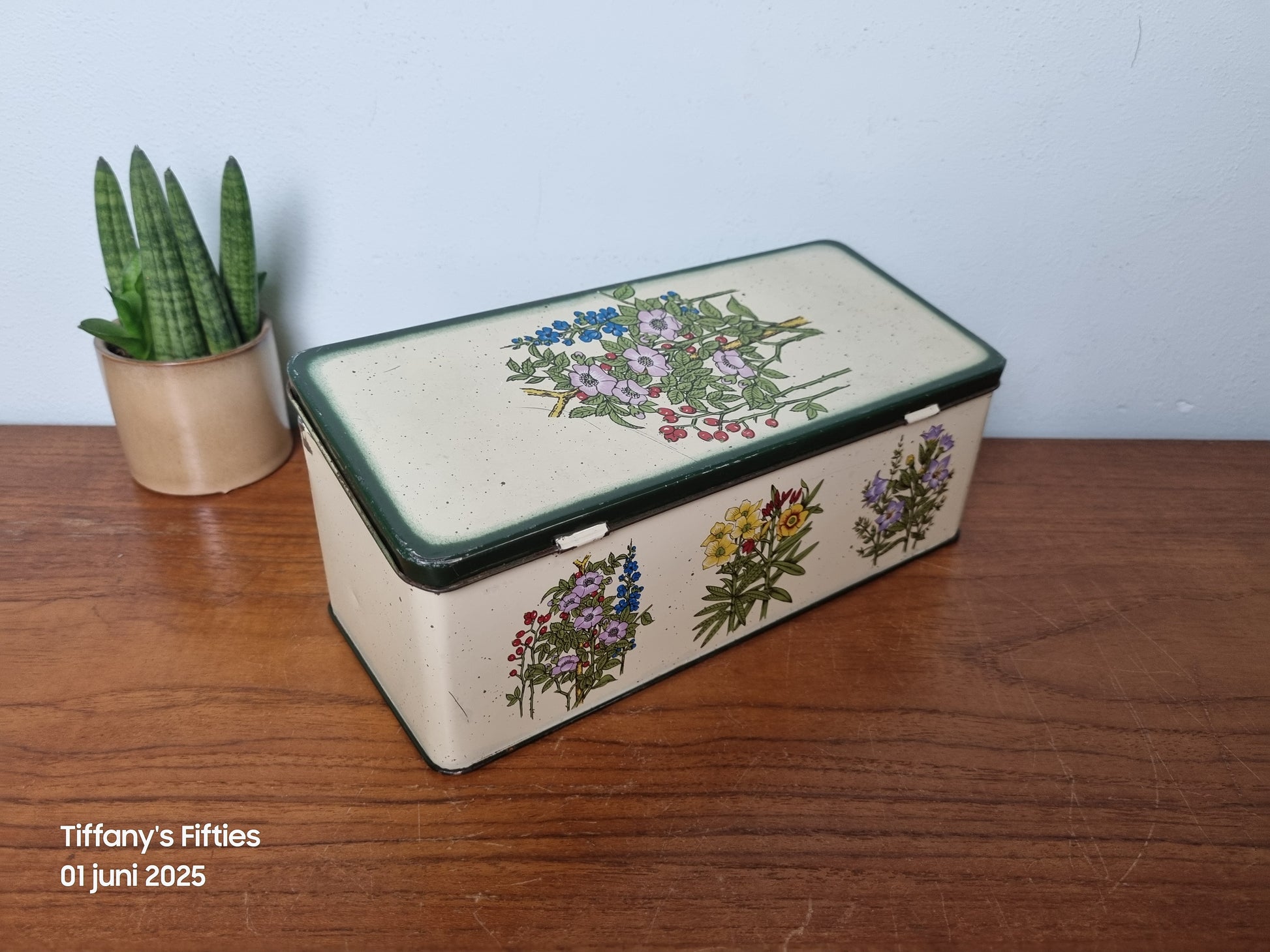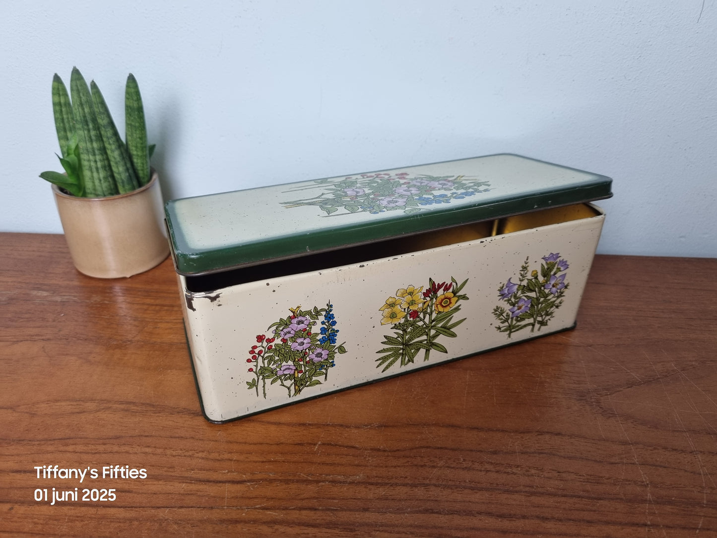 Liefdevol vintage blikken doos met roomkleurige basis, deksel met donkergroene rand en sierlijke veldbloemillustraties aan alle zijden. De langwerpige vorm maakt het ideaal voor het opbergen van theezakjes, bestek, naaigerei of andere kleine spulletjes. Het design straalt een landelijke charme uit, perfect voor een retro of cottagecore interieur.