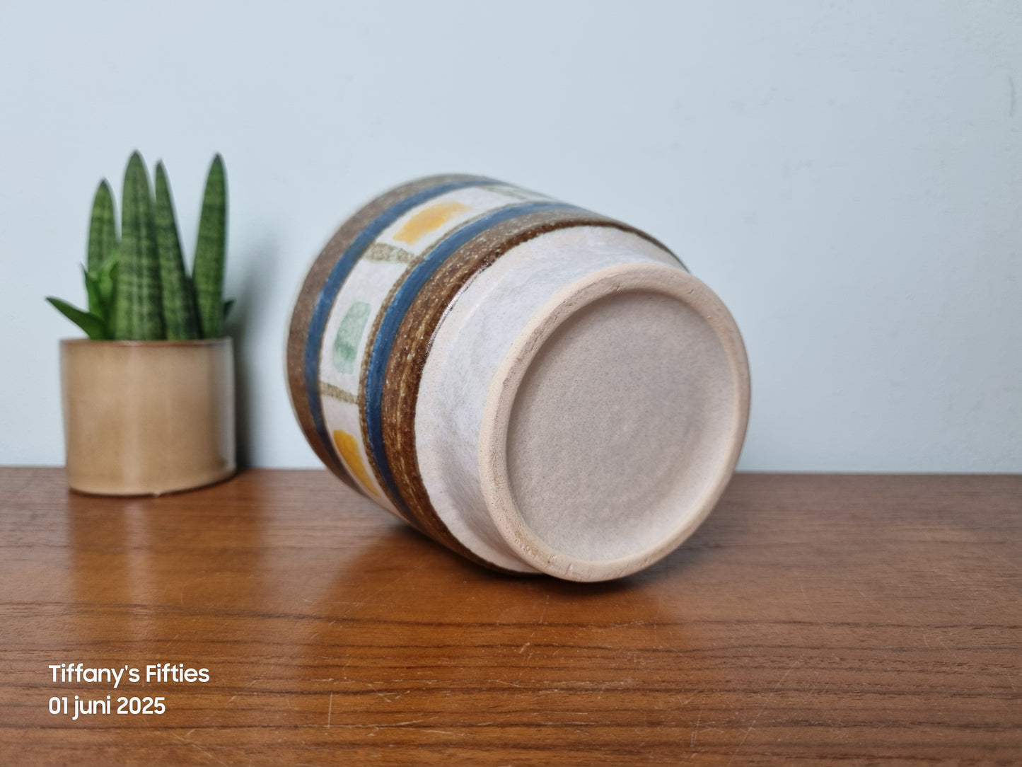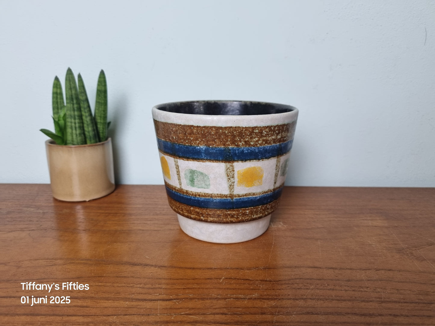 Karaktervolle vintage bloempot van geglazuurd keramiek, met een rustiek kleurenpalet van bruin, blauw, geel en groen. De pot is versierd met een geometrisch decor in horizontale banen, kenmerkend voor de jaren ’60 en ’70. De combinatie van aardetinten en strakke vormen maakt dit een echte eyecatcher in een retro of boho interieur.