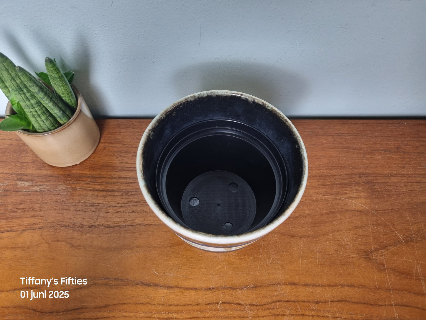 Perfect voor een kleine kamerplant, vetplant of als decoratief object op een plank of vensterbank. In goede vintage staat – geen chips of barsten. Diameter 12,5 cm, hoogte 11 cm.