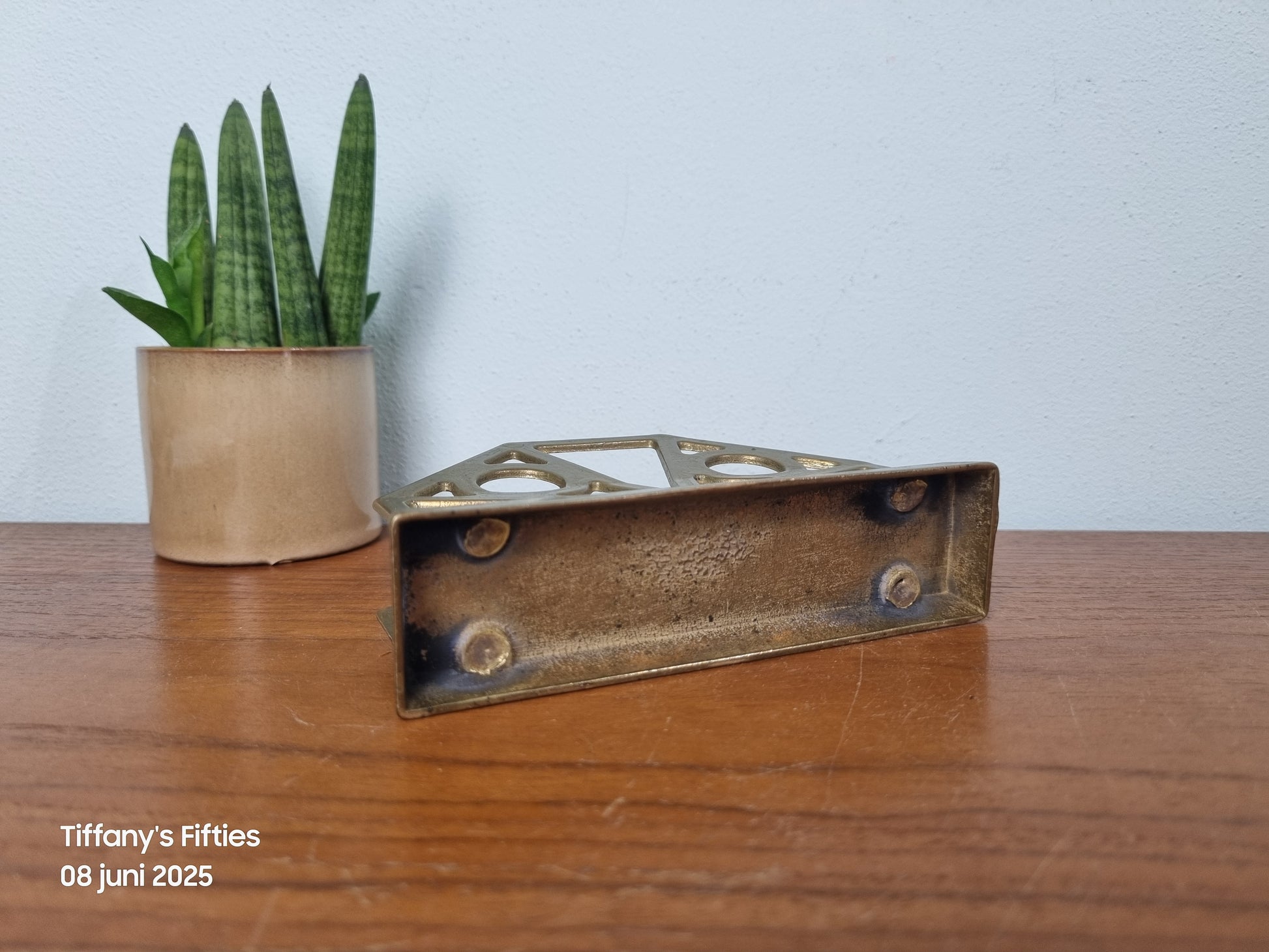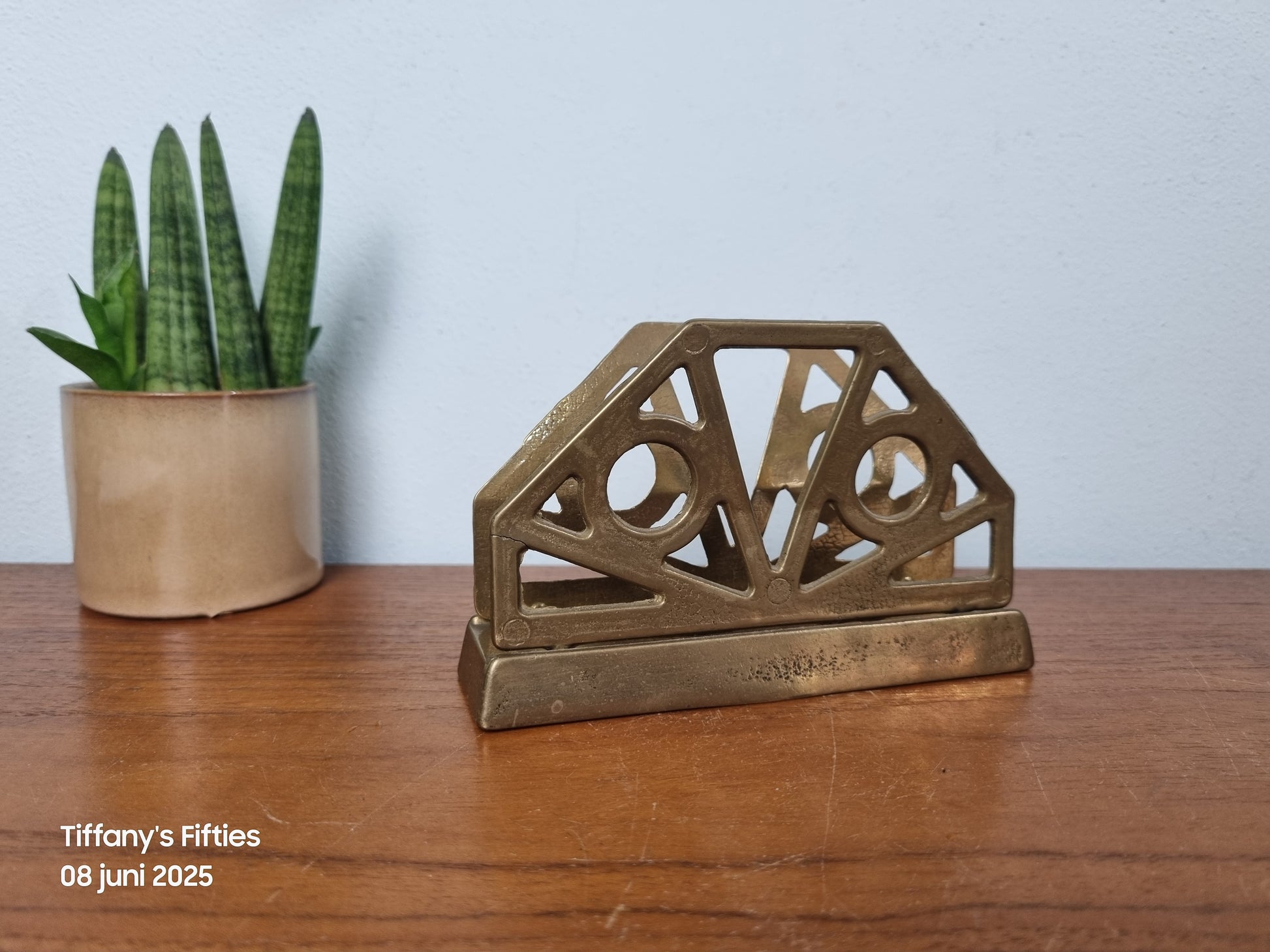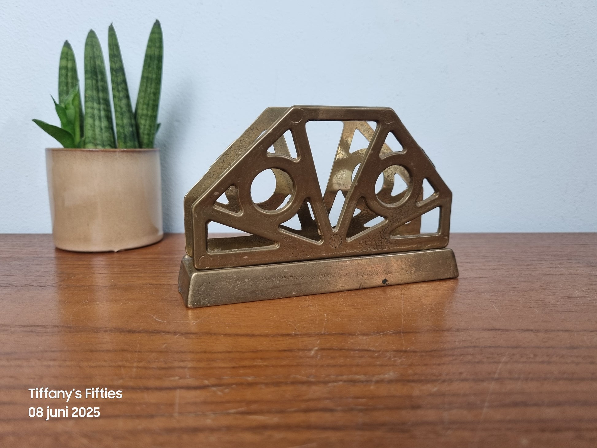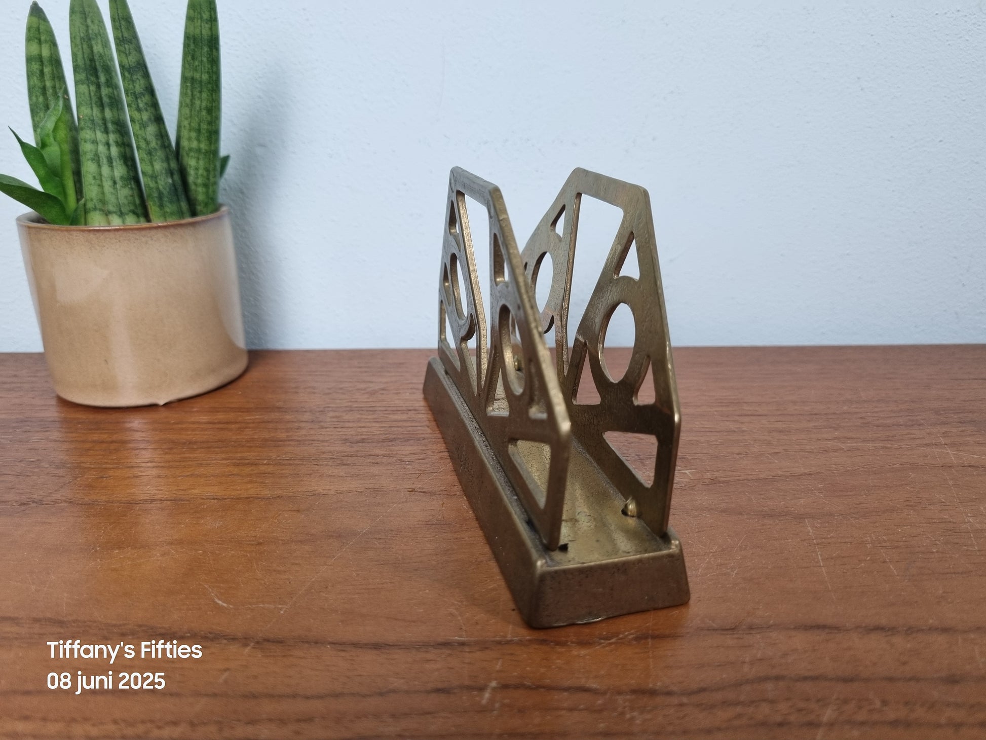 Vintage brieven- of servethouder in massief messing. Dit zwaar metalen stuk heeft een geometrisch opengewerkt ontwerp in art deco-stijl, met strakke lijnen en cirkels die zorgen voor een speelse balans tussen symmetrie en karakter.