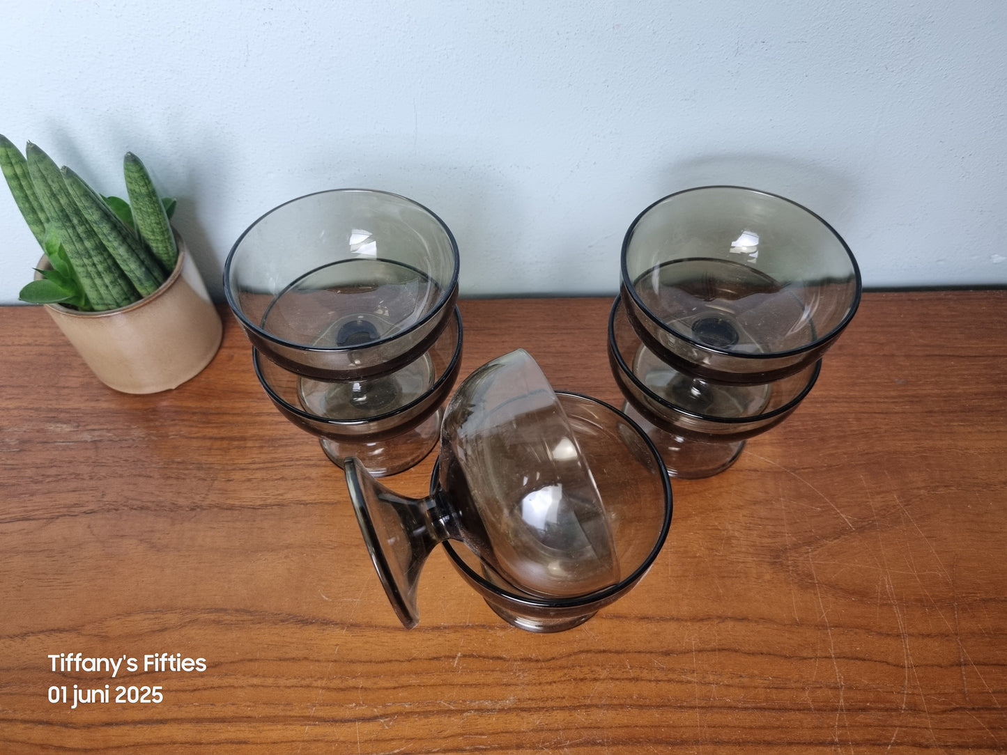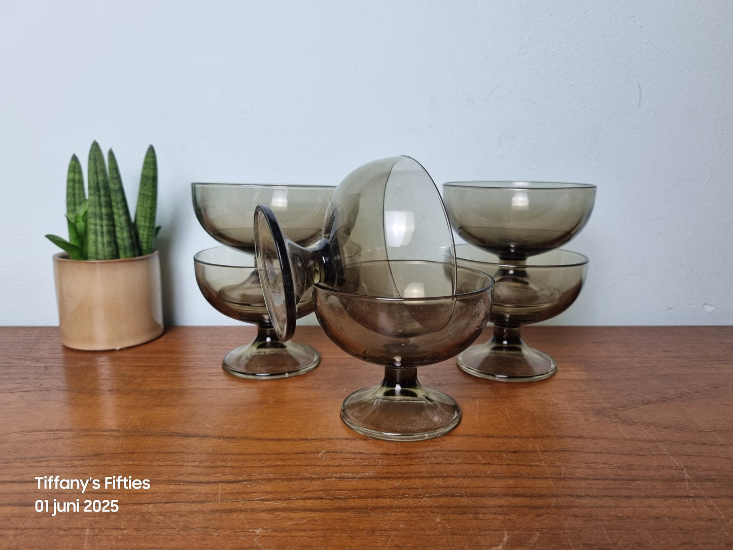 Elegante vintage dessertglazen in gerookt glas. De klassieke coupevorm op een stevige voet geeft deze glazen een chique en tijdloze uitstraling. De subtiele tint van het glas is typerend voor de jaren ’60 en ’70 en past prachtig in zowel een retro als modern interieur.