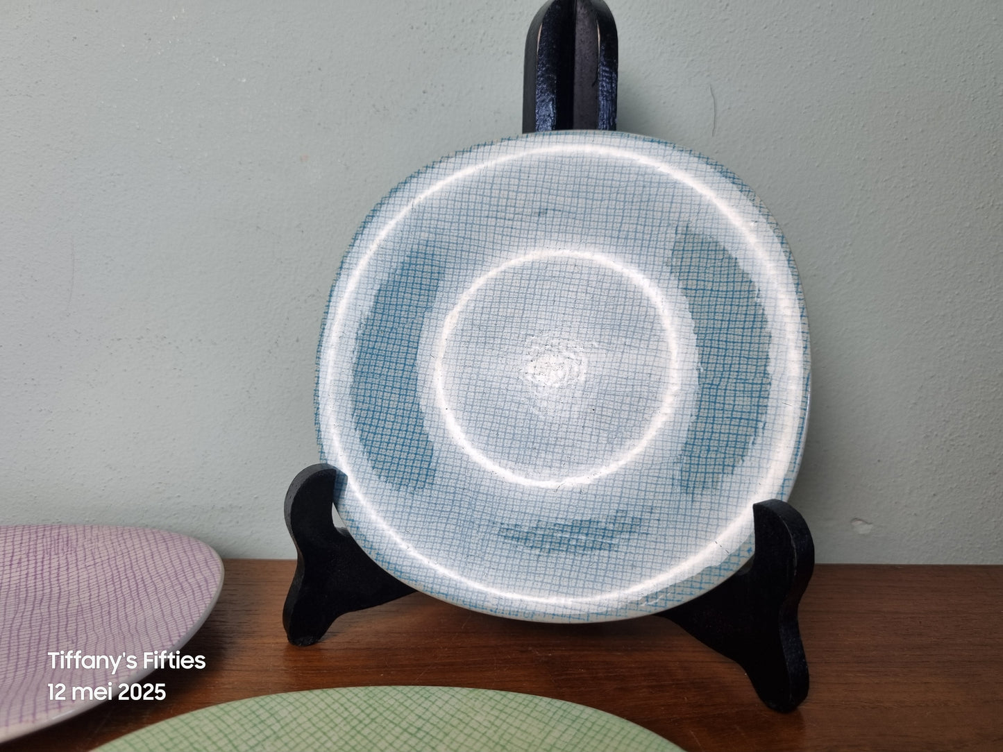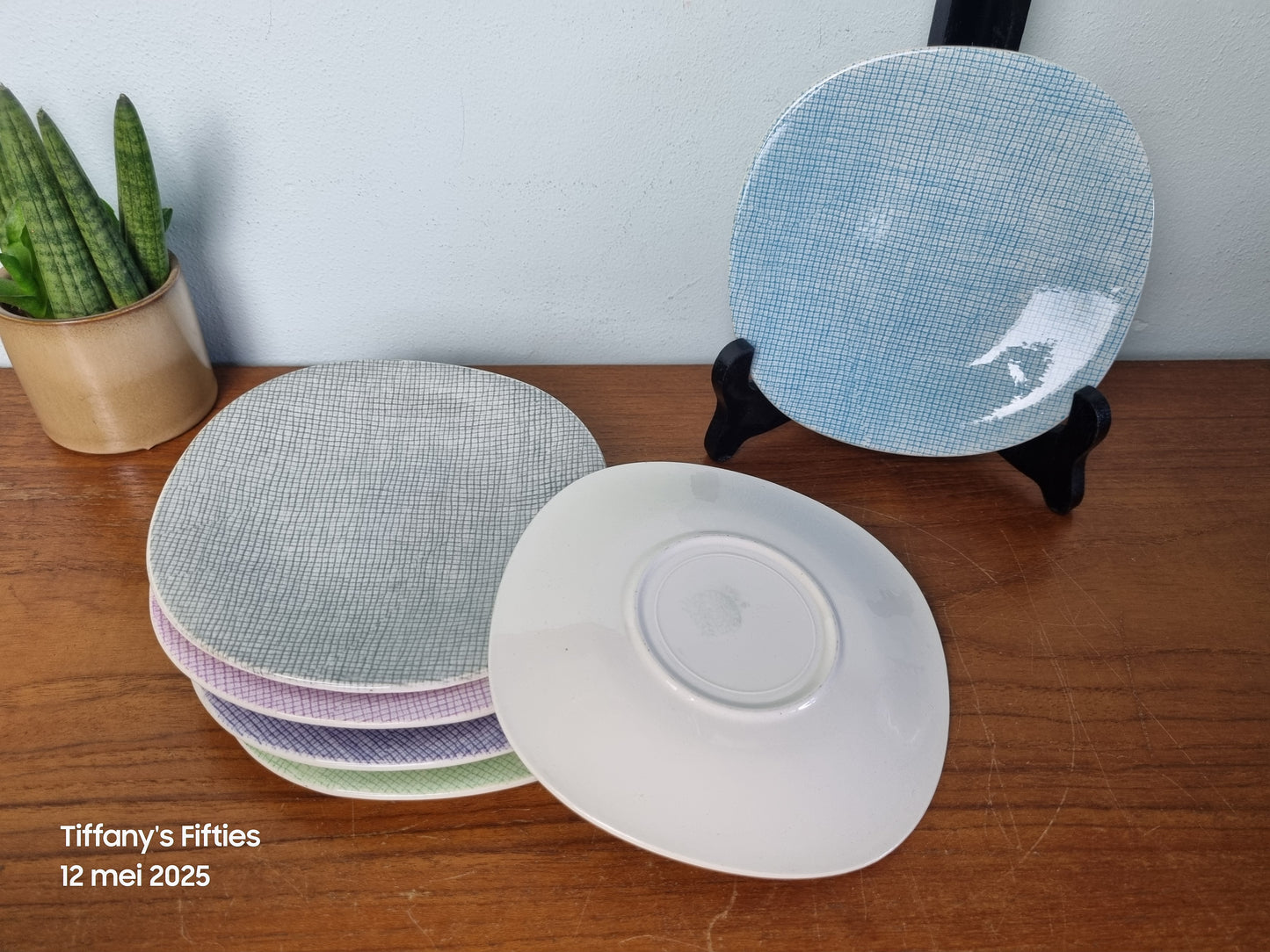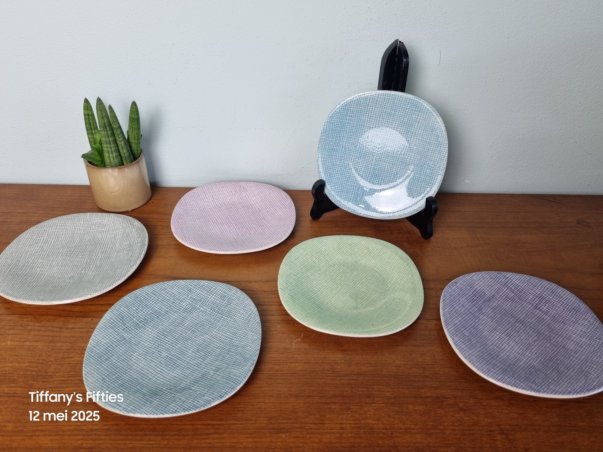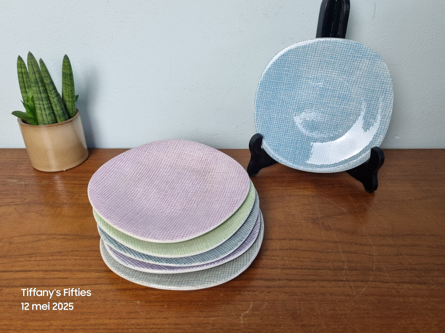 Charmante set van zes vintage gebaksbordjes van Boch La Louviere . Elk bordje heeft een subtiel, grafisch ruitpatroon genaamd Fil à Fil in zachte pasteltinten zoals lila, groen, blauw, roze en grijs op een licht organische vorm die typerend is voor de jaren ’50. De mix van kleuren en texturen maakt deze set zowel speels als elegant.