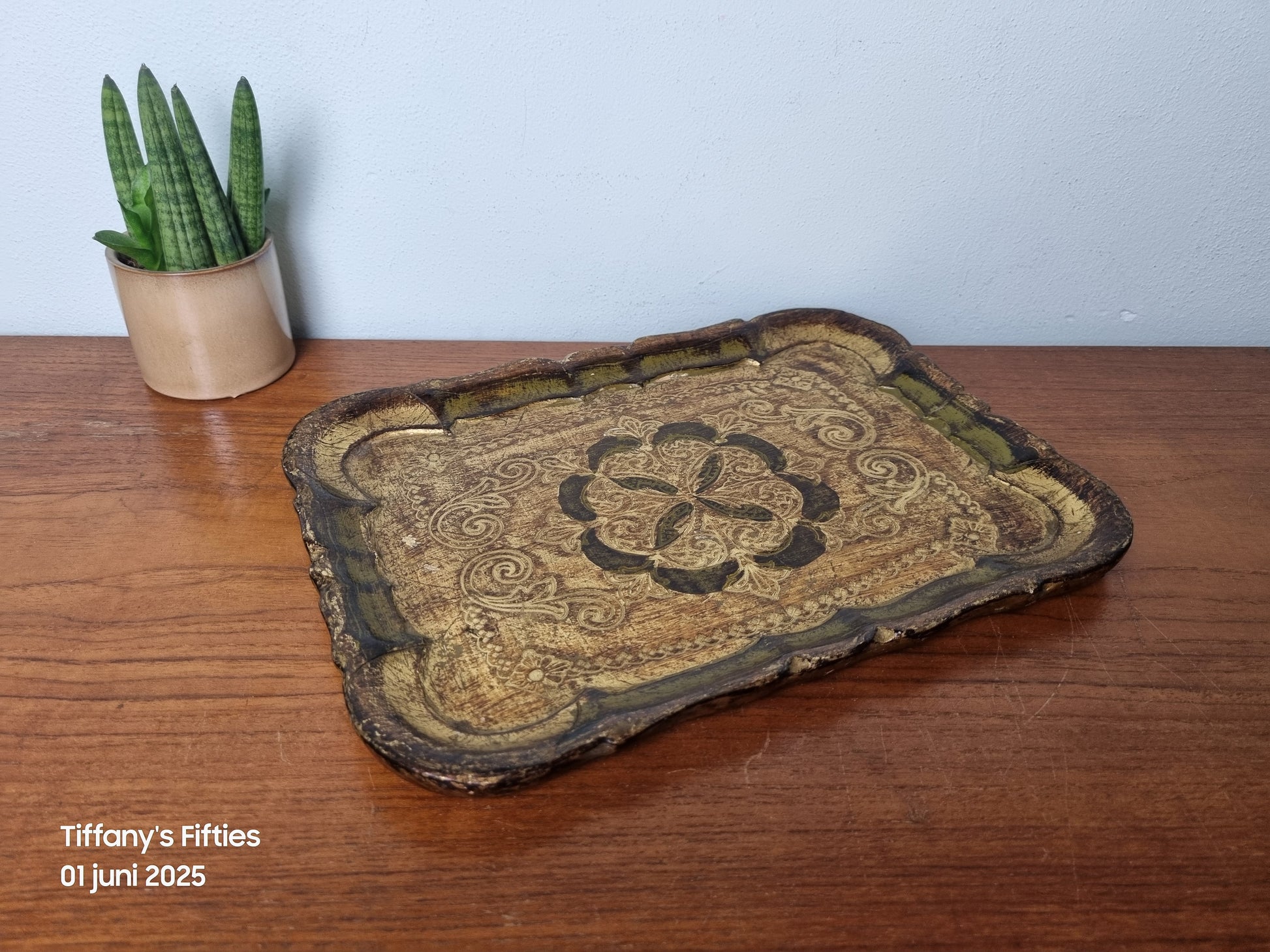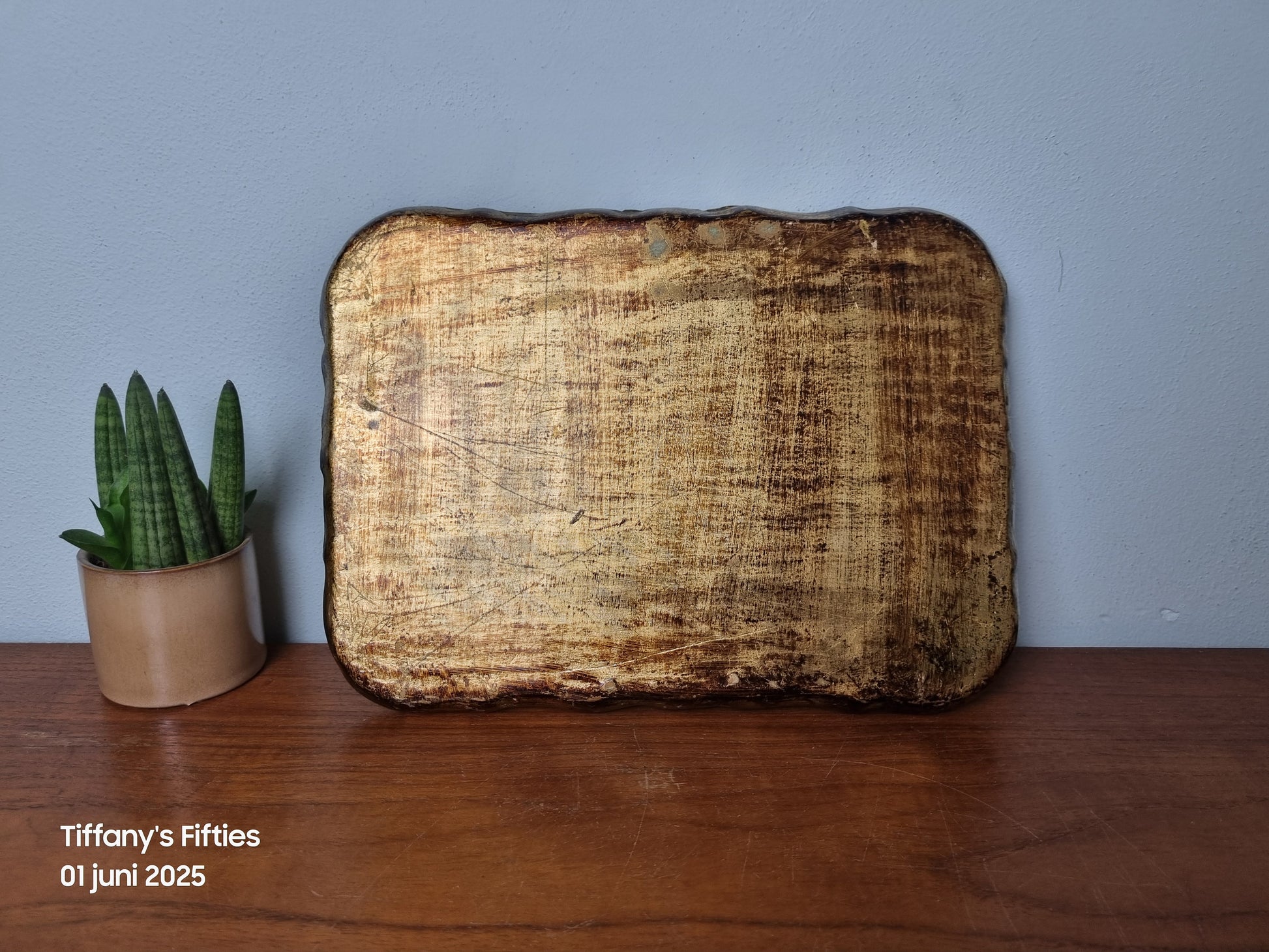 Sfeervol vintage dienblad van hout, met een handbeschilderde afwerking in goud- en bronskleuren en een rijk gedetailleerd barokmotief in het midden. Het dienblad heeft een sierlijke golvende rand en een licht verweerde patina die bijdraagt aan de authentieke charme. Afkomstig uit Italië of in Italiaanse stijl, vaak aangeduid als “Florentijns dienblad”. Afmetingen 21,5 x 30 cm.