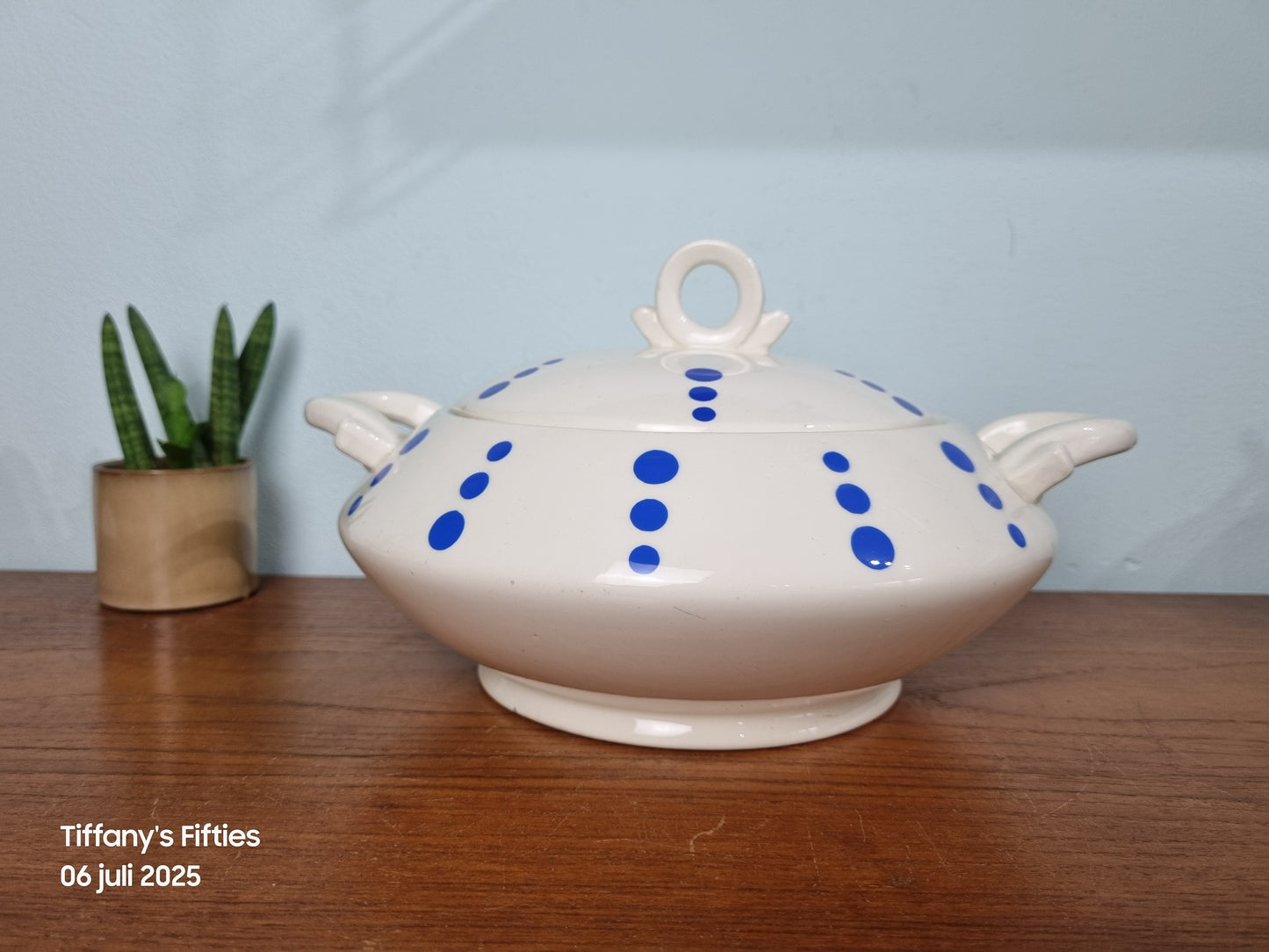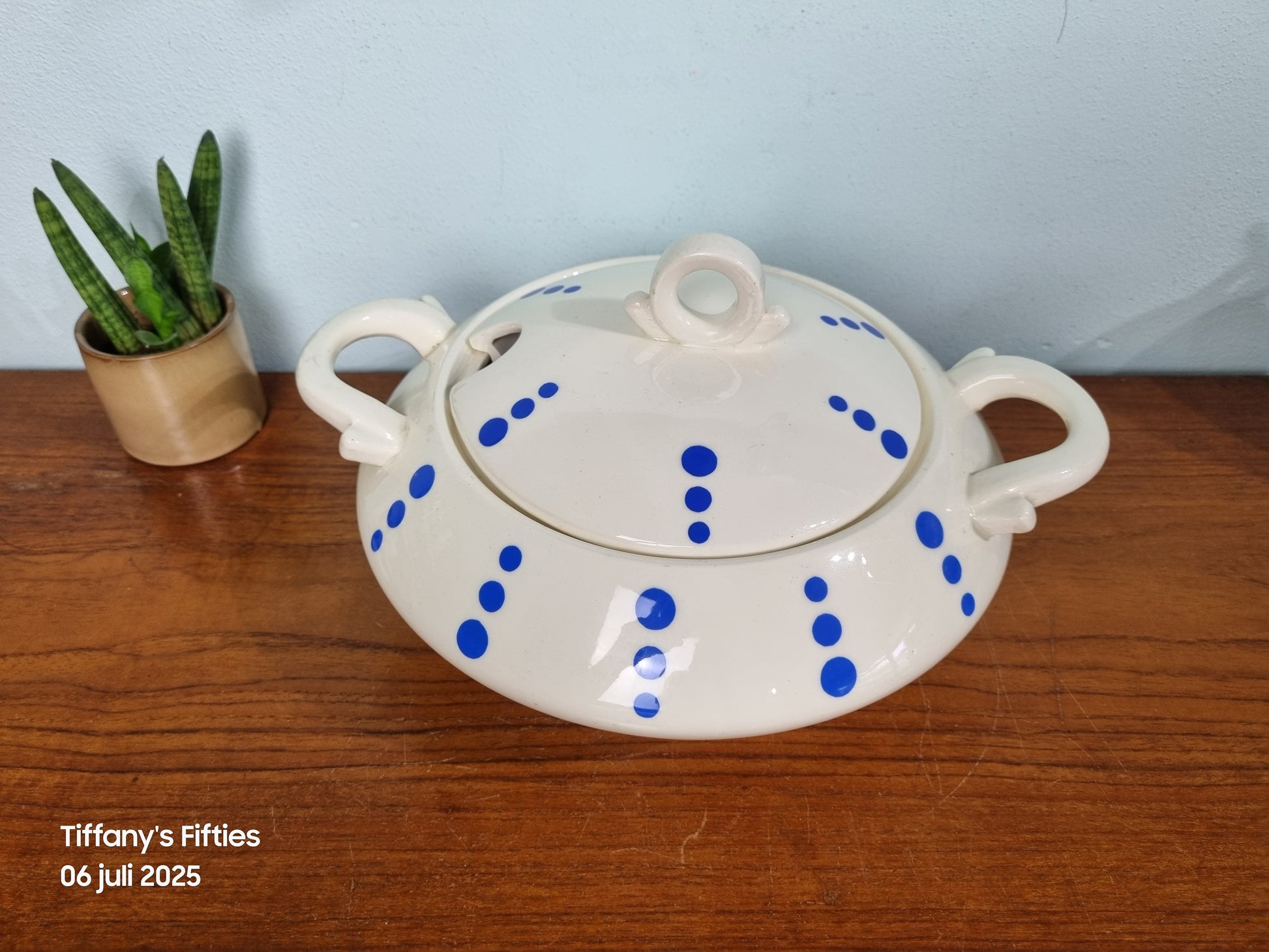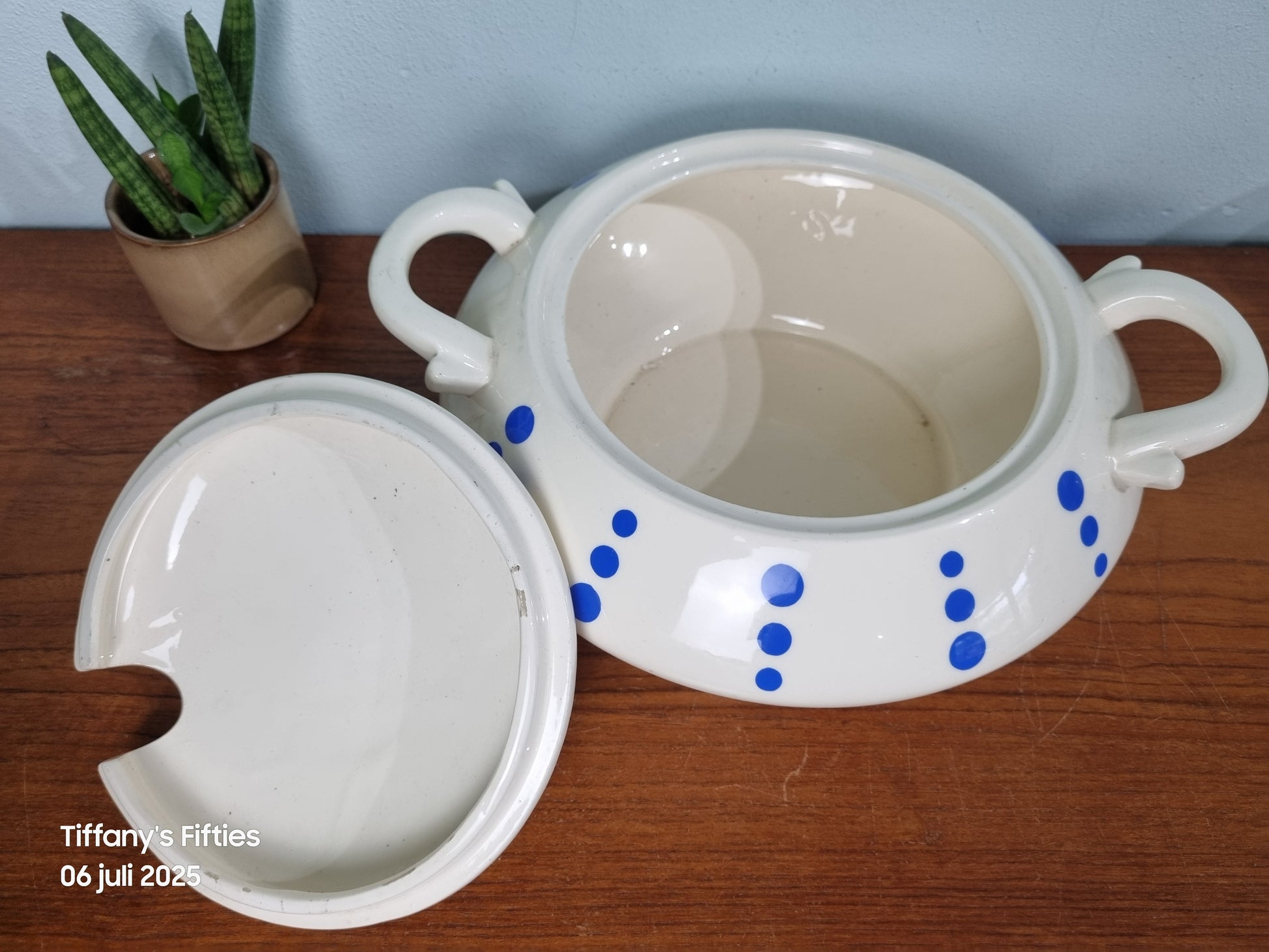 Deze opvallende vintage soepterrine is een prachtig voorbeeld van speels modernistisch design uit de jaren ’50 of vroege jaren ’60. Het wit geglazuurde aardewerk is gedecoreerd met een patroon van kobaltblauwe stippen in een geometrisch ritme, wat het geheel een vrolijke, bijna grafische uitstraling geeft. De sierlijke handvatten en het ronde dekselknopje maken het een bijzonder stijlvol tafelstuk.
