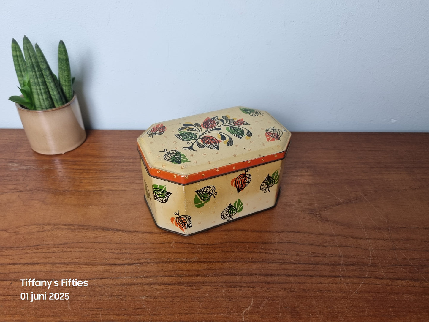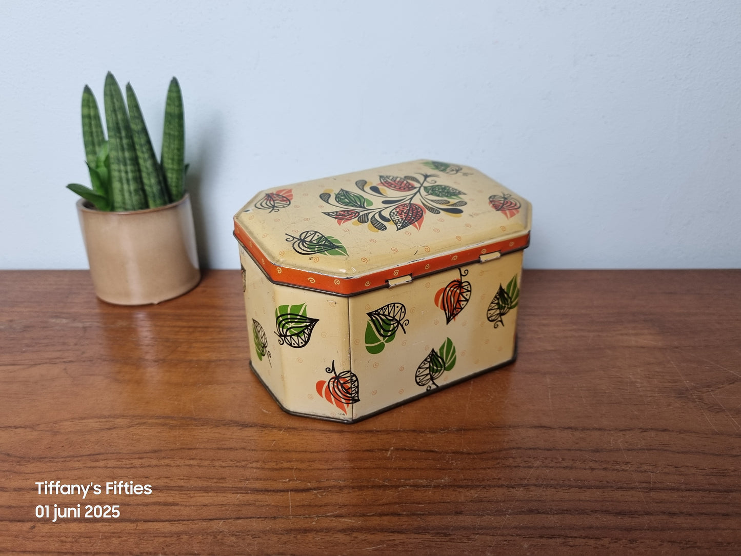 Vrolijk vintage theeblik met speelse bladdecoratie in rood, groen, oranje en zwart op een beige achtergrond. De oranje bies langs het deksel geeft het blik een extra kleuraccent. De grafische bladvormen en kleurencombinatie zijn typisch voor de jaren ’50 en ’60.