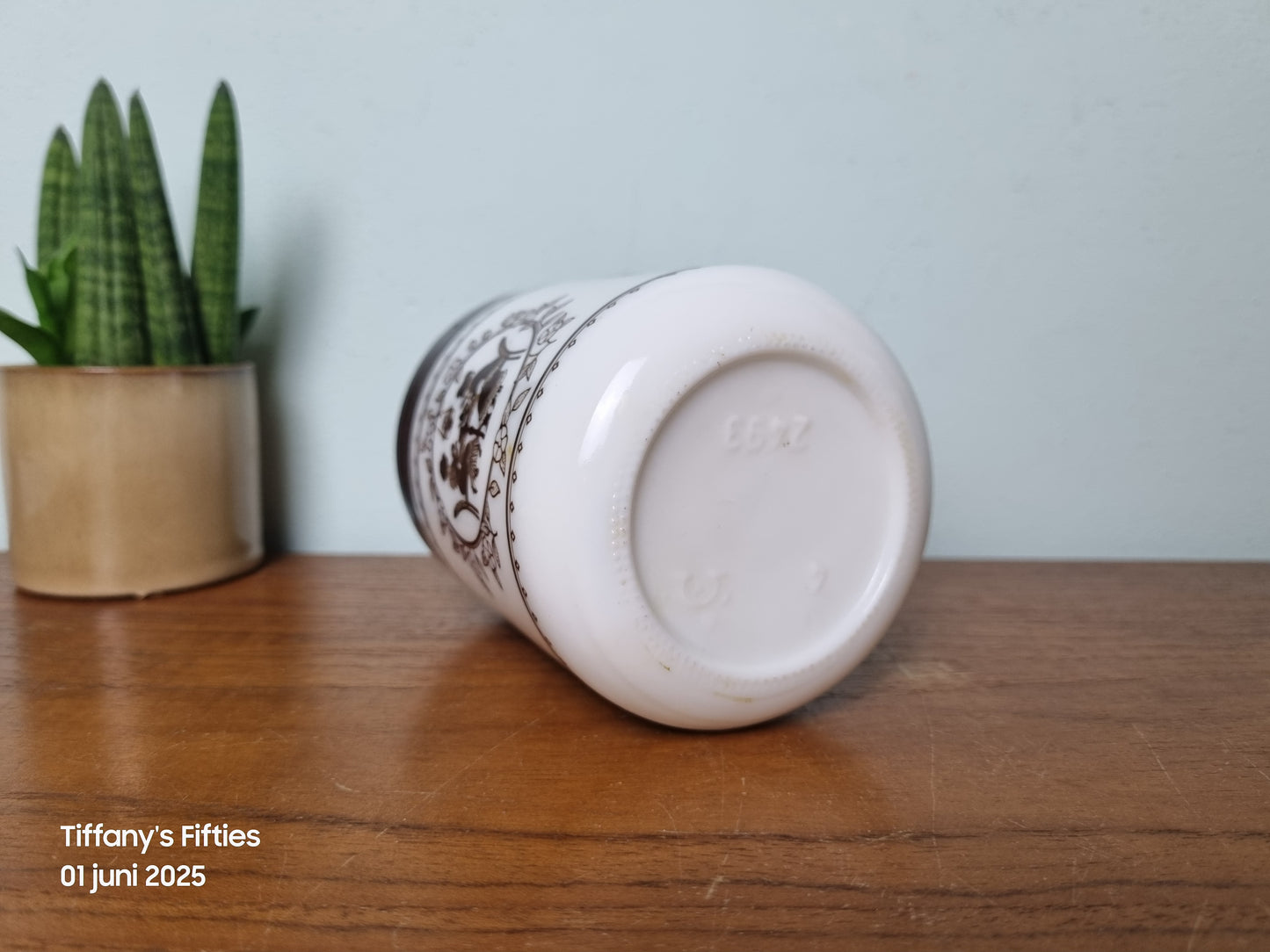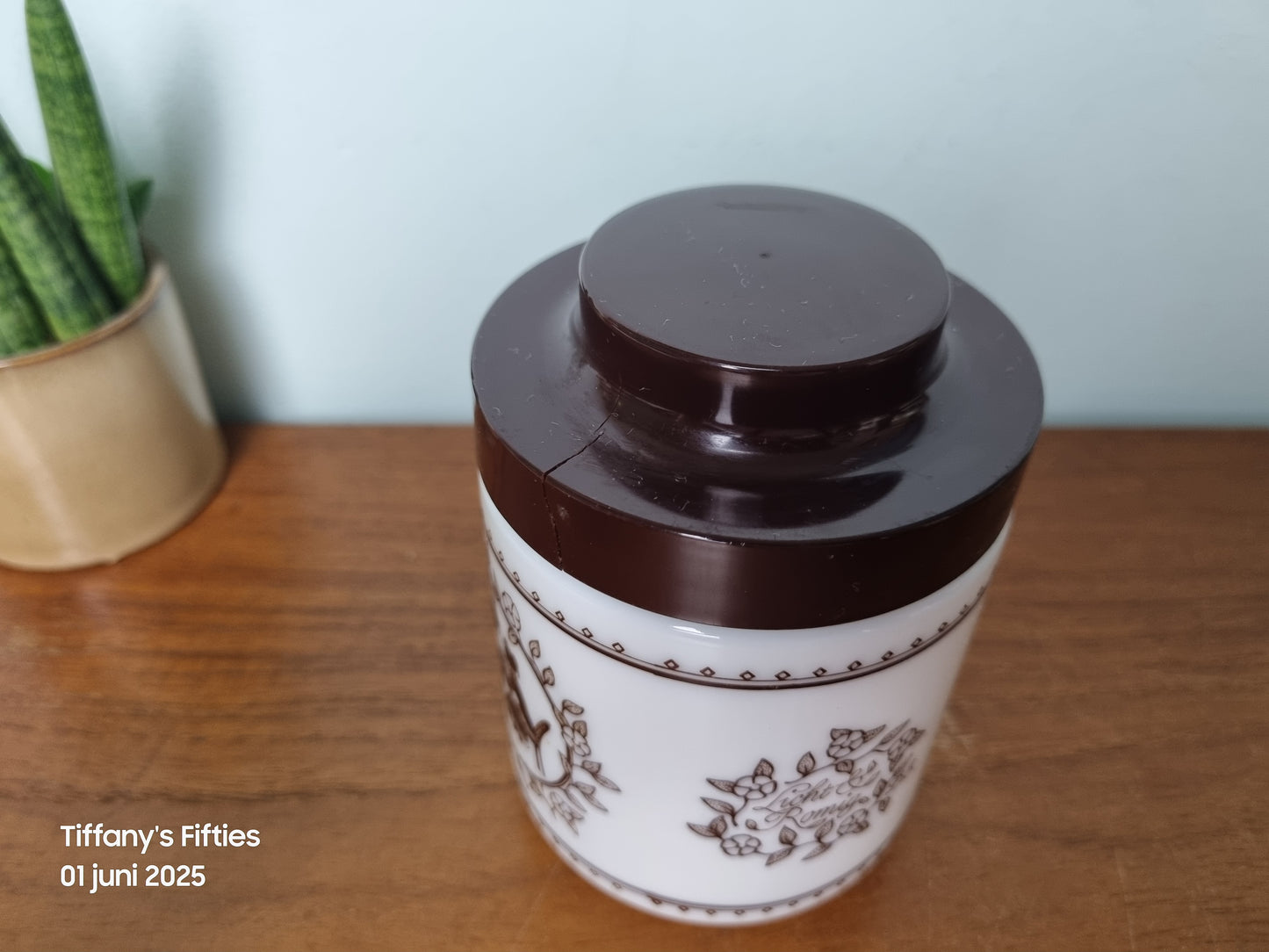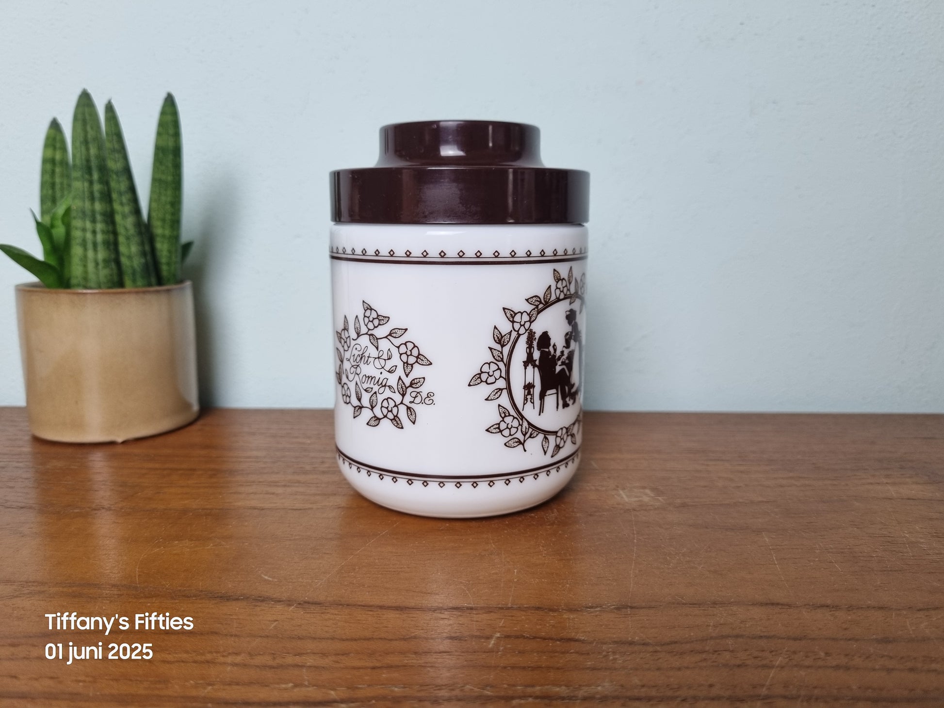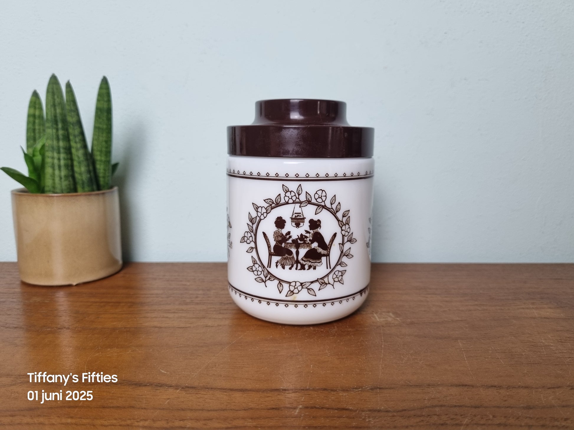 Sfeervolle vintage voorraadpot van wit glas met een donkerbruin kunststof deksel. De pot is rondom versierd met een charmant bruin silhouetdecor van een theetafereel binnen een bladkrans – een tafereel dat doet denken aan klassieke Hollandse of landelijke motieven uit de jaren ’60 en ’70.